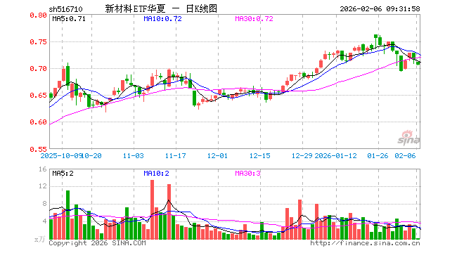 2月6日,新材料ETF华夏(516710)开盘跌0.56%,报0.711元。新材料ETF华夏(516710)重仓股方面,北方华创开盘跌0.45%,宁德时代跌1.00%,万华化学跌2.00%,隆基绿能跌0.99%,华友钴业跌3.31%,天赐材料跌1.22%,三环集团跌2.25%,通威股份跌0.98%,三安光电跌1.77%,宝丰能源跌2.25%。