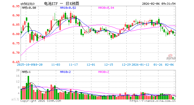 2月6日,电池ETF(561910)开盘跌0.75%,报0.794元。电池ETF(561910)重仓股方面,阳光电源开盘跌1.37%,宁德时代跌1.00%,三花智控跌1.46%,亿纬锂能跌0.99%,天赐材料跌1.22%,先导智能跌1.45%,格林美跌1.77%,国轩高科跌2.05%,多氟多跌0.86%,欣旺达跌0.69%。