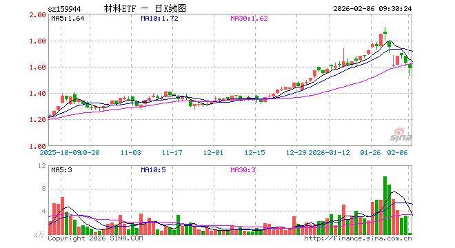 2月6日,材料ETF(159944)开盘跌0.68%,报1.618元。材料ETF(159944)重仓股方面,紫金矿业开盘跌5.07%,洛阳钼业跌5.28%,万华化学跌2.00%,北方稀土跌2.71%,华友钴业跌3.31%,中国铝业跌3.64%,盐湖股份跌2.46%,赣锋锂业跌3.04%,山东黄金跌3.97%,云铝股份跌1.78%。