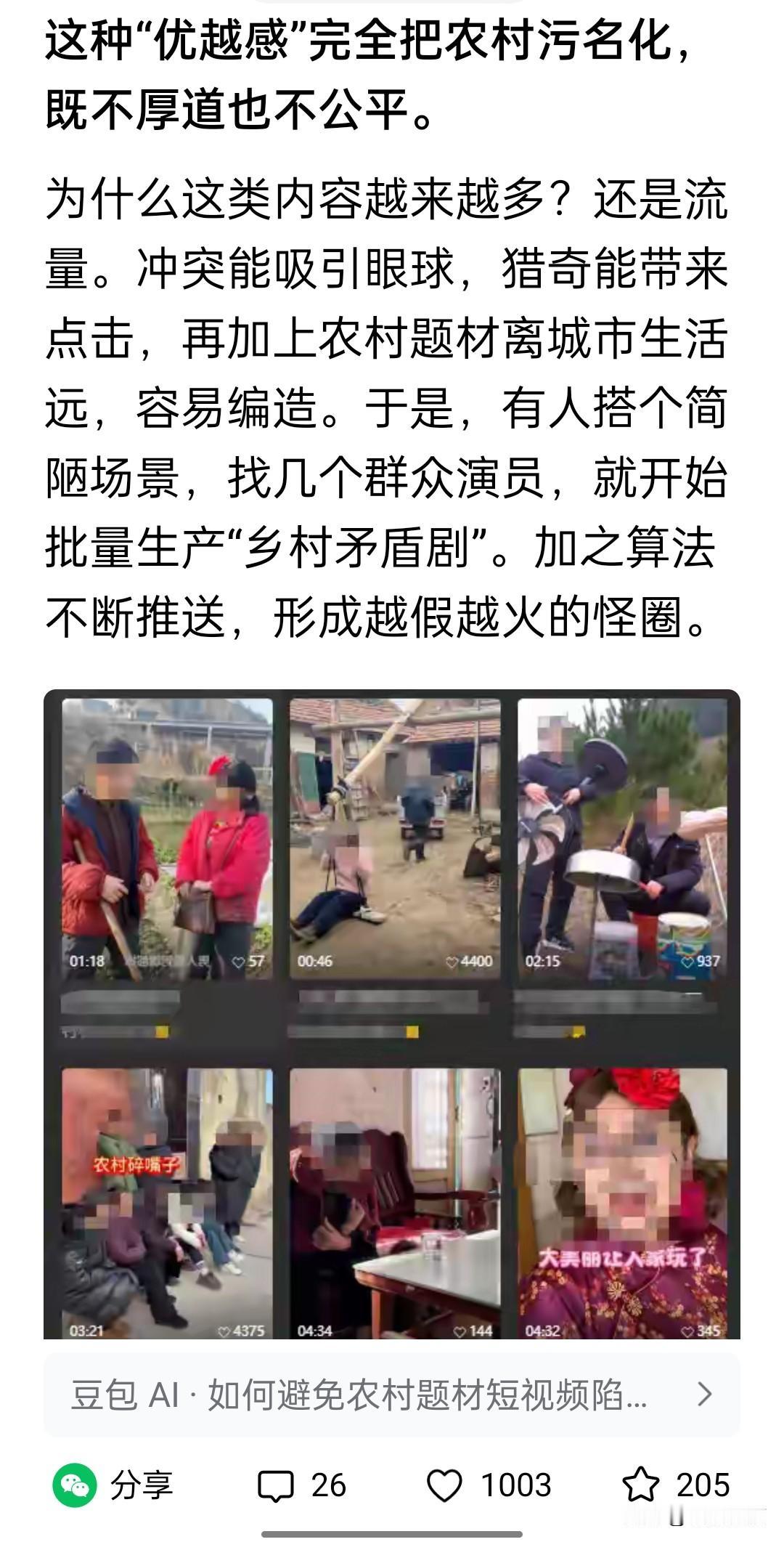 中国经济周刊发文说“丑化农村,此风当刹”,意思是说许多农村题材的短视频刻意夸大矛盾、丑化农民形象,以此吸引眼球。 我也是农村出来的,对农村生活有些了解,没那么美好,也没那么不堪,就是普通人会有的样子。我很少看短视频,更不喜欢粗制滥造表演浮夸的内容,无论它们是在“丑化农村”,还是在“丑化城镇”。关键不在于什么地方,而在于“丑化”有没有现实基础。 我不认为这类夸大其词的作品会有太大的市场,如果有,那就说明它们有生存的土壤,还是任其自生自灭比较好。[笑哭]农民形象