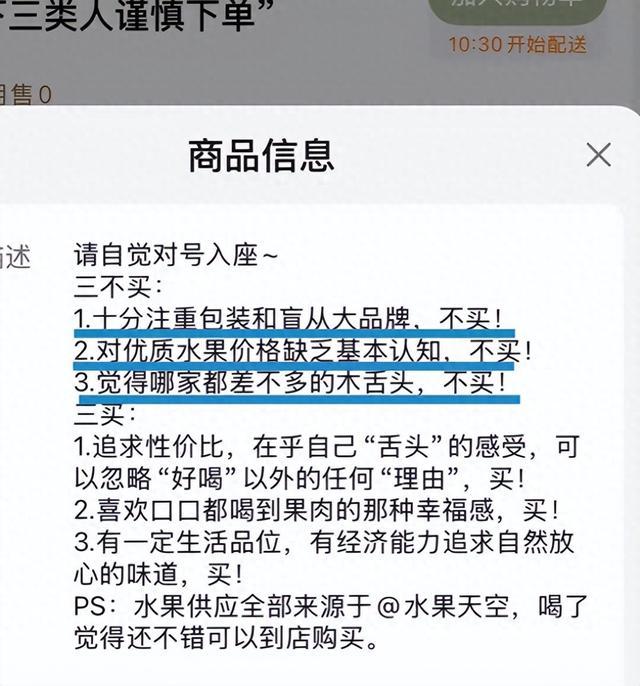近日,广西南宁有网友在社媒晒出当地一奶茶品牌点单主页显示有“以下三类人谨慎下单”选项,详情页显示:十分注重包装和盲从大品牌,不买!对优质水果价格缺乏基本认知,不买!觉得哪家都差不多的木舌头,不买!不少网友纷纷留言,称其教育消费者,并喊话其道歉。