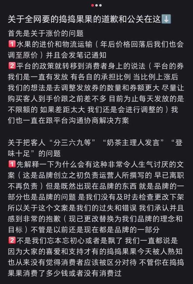 随后,该奶茶品牌在其账号发布“道歉和公关”说明,称该部分内容为品牌创立之初负责运营人所撰写,且早已离职,品牌承认过失和错误,并感到非常抱歉,目前已更改替换为品牌理念和目标。