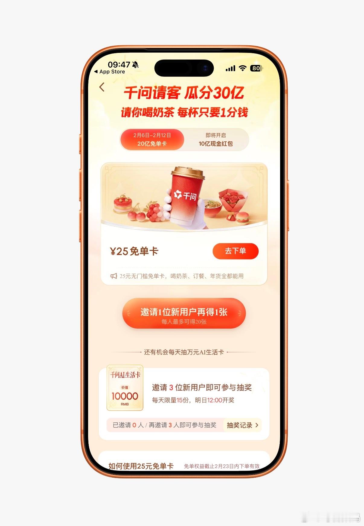 千问的活动也开始了,是0.01请大家喝奶茶,喝上了吗