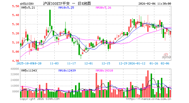2月6日,截止午间收盘,沪深300ETF平安(510390)跌0.29%,报5.220元,成交额544.96万元。沪深300ETF平安(510390)重仓股方面,宁德时代截止午盘涨2.52%,贵州茅台跌2.68%,中国平安跌0.88%,中际旭创跌0.57%,紫金矿业涨0.27%,招商银行跌0.65%,新易盛跌2.14%,美的集团跌0.89%,兴业银行跌0.27%,长江电力跌0.56%。
