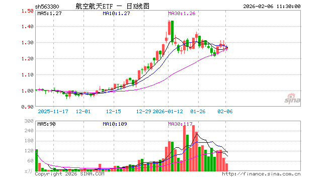 2月6日,截止午间收盘,航空航天ETF(563380)跌1.25%,报1.269元,成交额5627.14万元。航空航天ETF(563380)重仓股方面,航天电子截止午盘跌0.15%,中国卫星跌0.12%,航发动力跌1.88%,中航沈飞跌1.15%,中航光电跌0.26%,中航西飞跌2.53%,中航机载跌2.20%,中航成飞跌0.68%,中航重机跌1.64%。