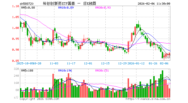 2月6日,截止午间收盘,科创创新药ETF国泰(589720)涨0.80%,报0.885元,成交额8800.33万元。科创创新药ETF国泰(589720)重仓股方面,百济神州截止午盘跌0.32%,艾力斯涨0.28%,百利天恒跌1.30%,君实生物涨0.74%,泽璟制药涨2.61%,博瑞医药涨1.51%,荣昌生物涨2.44%,特宝生物跌1.76%,益方生物涨2.78%,皓元医药涨0.13%。