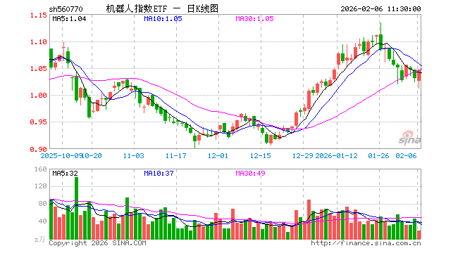 2月6日,截止午间收盘,机器人指数ETF(560770)涨1.36%,报1.045元,成交额1842.78万元。机器人指数ETF(560770)重仓股方面,科大讯飞截止午盘跌0.68%,汇川技术涨0.66%,拓普集团涨5.85%,大华股份跌0.38%,大族激光跌0.20%,双环传动涨2.22%,石头科技涨0.26%,中控技术跌2.07%,绿的谐波涨7.25%,机器人涨1.05%。
