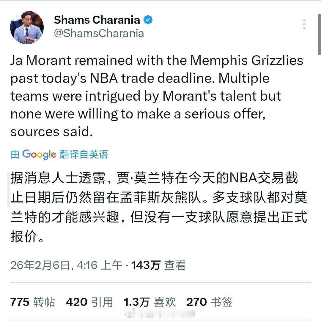 热火内部讨论过,只是鉴于他的各种原因放弃了,据shams报道,多支球队对莫兰特感兴趣,只是没人报价,没想到莫兰特现在的行情是没有行情nba交易