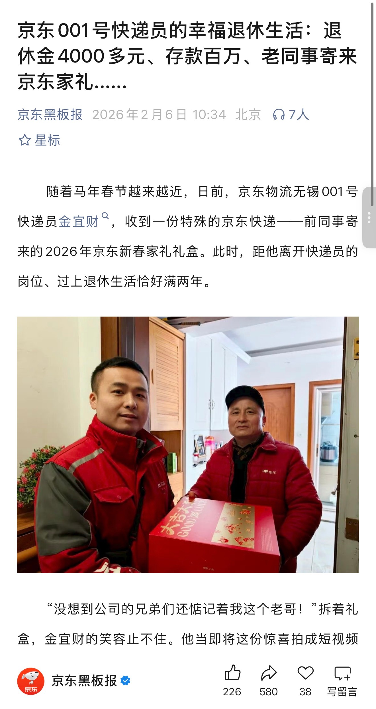 京东黑板报推送了一条消息,说京东物流无锡001号快递员的退休工资4000多。但我