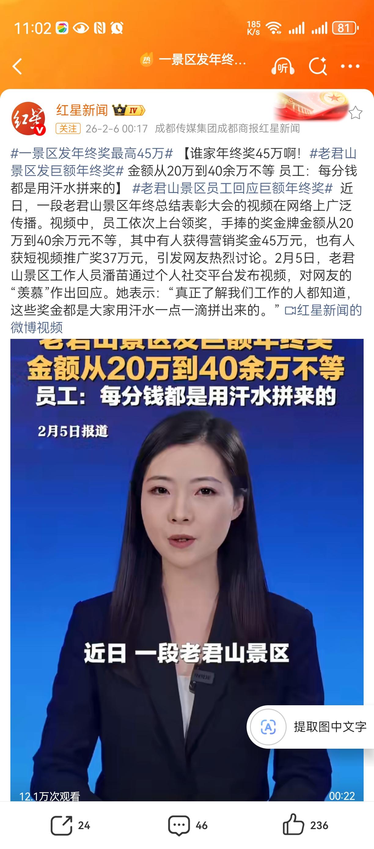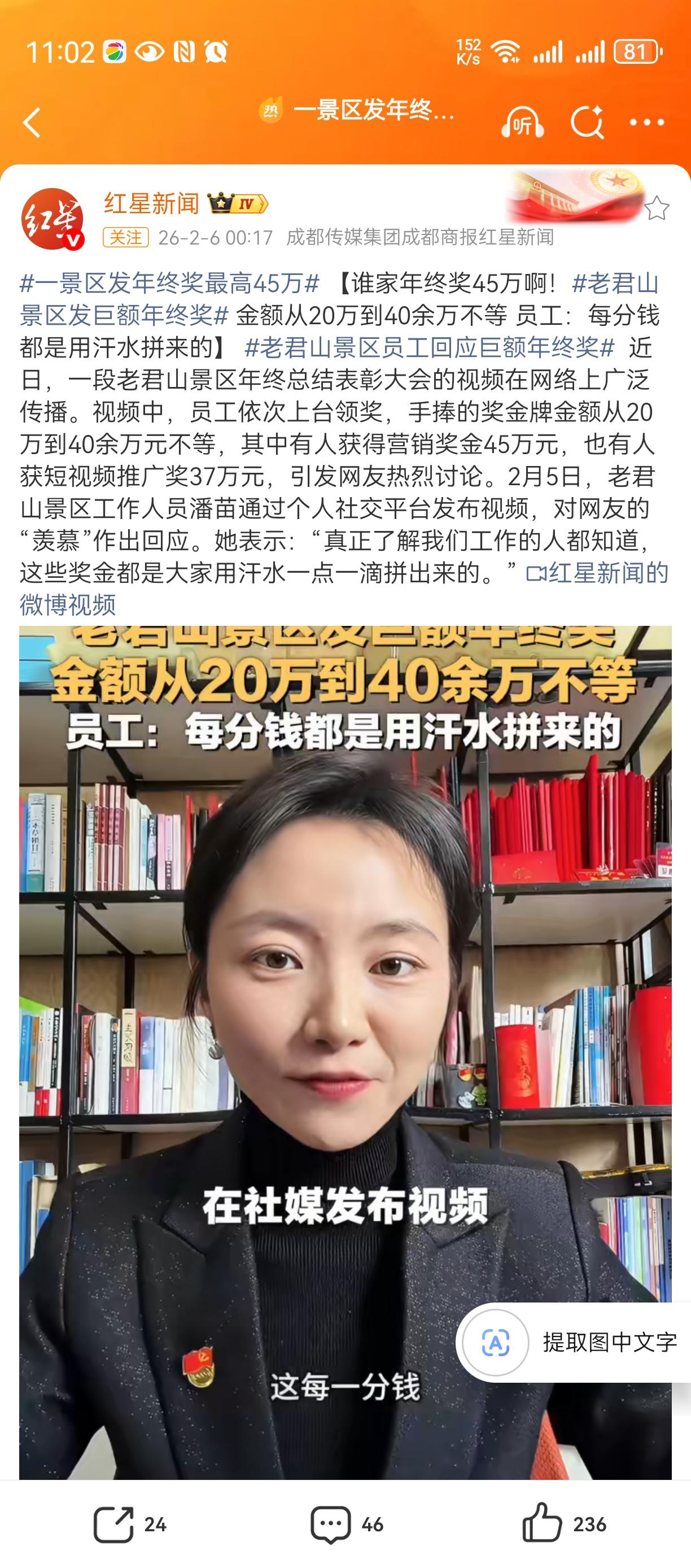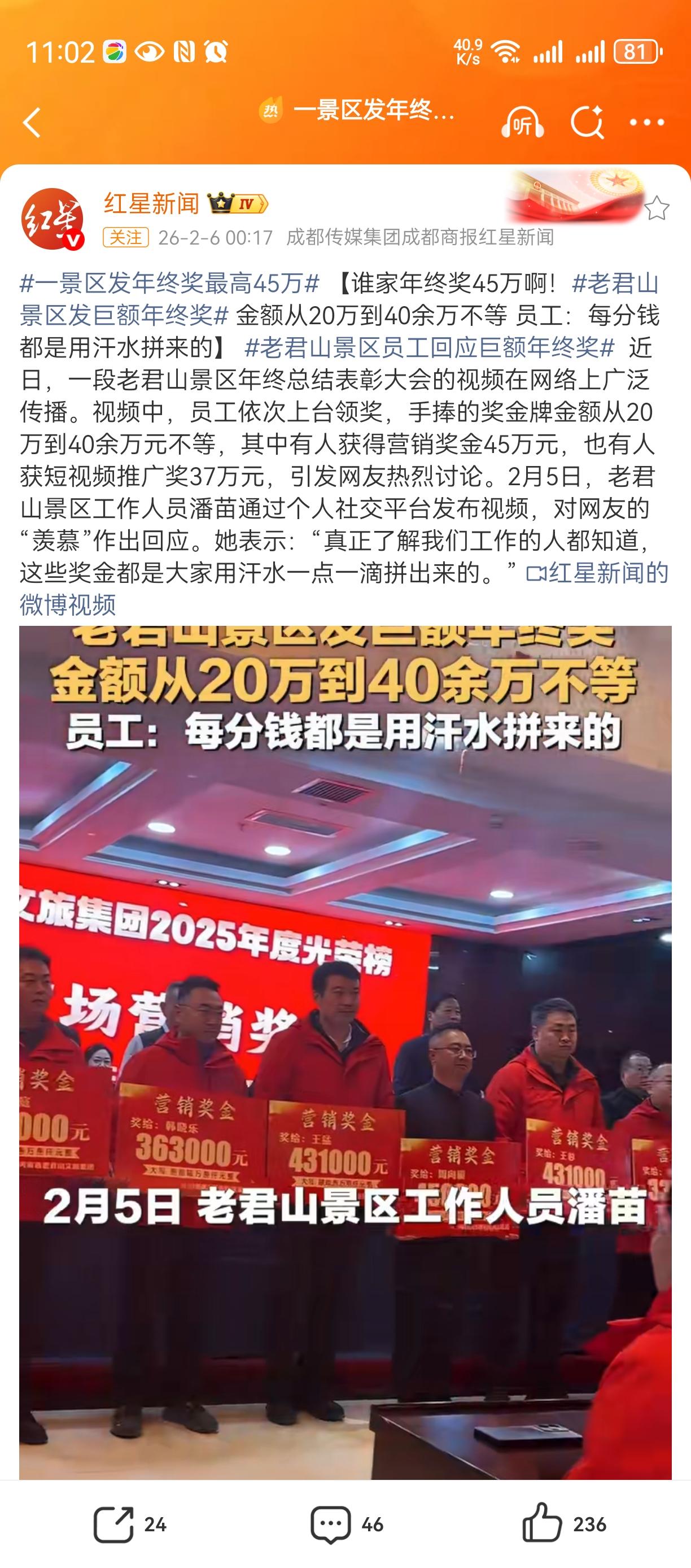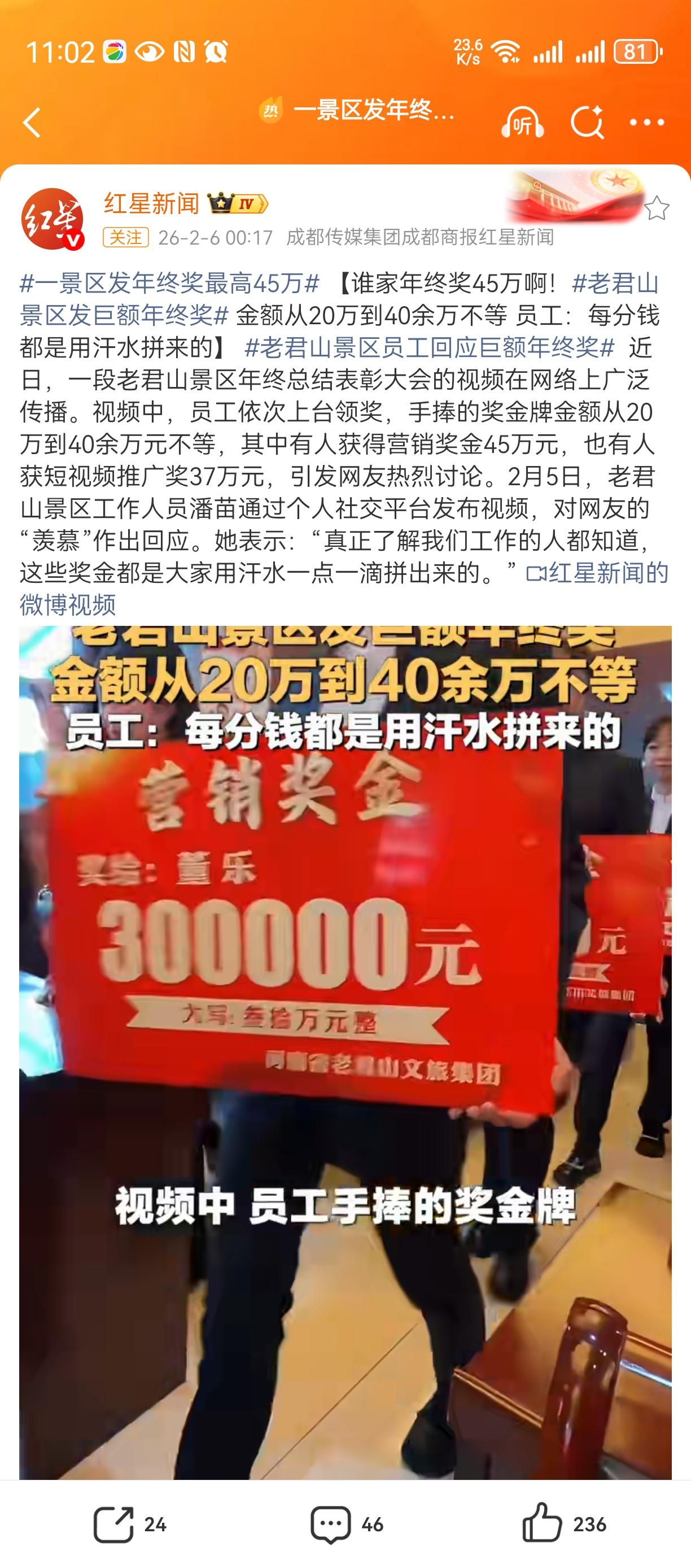 这真是太让人羡慕了。看来老君山景区确实赚了很多的钱。景区发巨额年终奖,有员