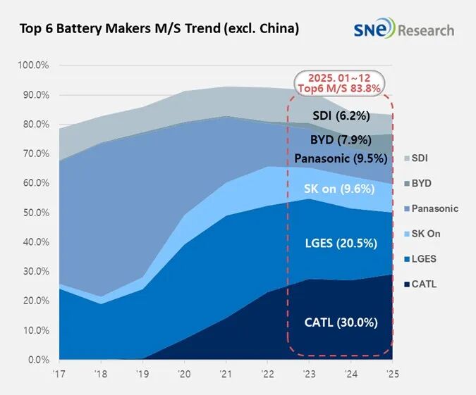 2025年的数据揭示了一个残酷的现实:全球电池市场正在经历“中进韩退”的结构性调整。LG新能源、SKOn和三星SDI不仅面临来自宁德时代的规模压制,还要应对BYD、SVOLT等“价格屠夫”的侧翼包抄。随着Top6厂商拿走市场83.8%的份额,留给尾部厂商的生存空间已所剩无几。