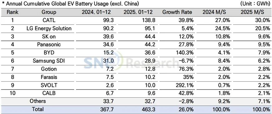 比亚迪凭借“垂直整合”的成本优势,在海外市场跑出了140.3%的惊人增速。其装机量达到36.6GWh,市场份额从去年的4.1%几乎翻倍至7.9%。目前比亚迪已稳居全球第五,且距离第四名松下(9.5%)的差距正在迅速缩小,超越之势已现。