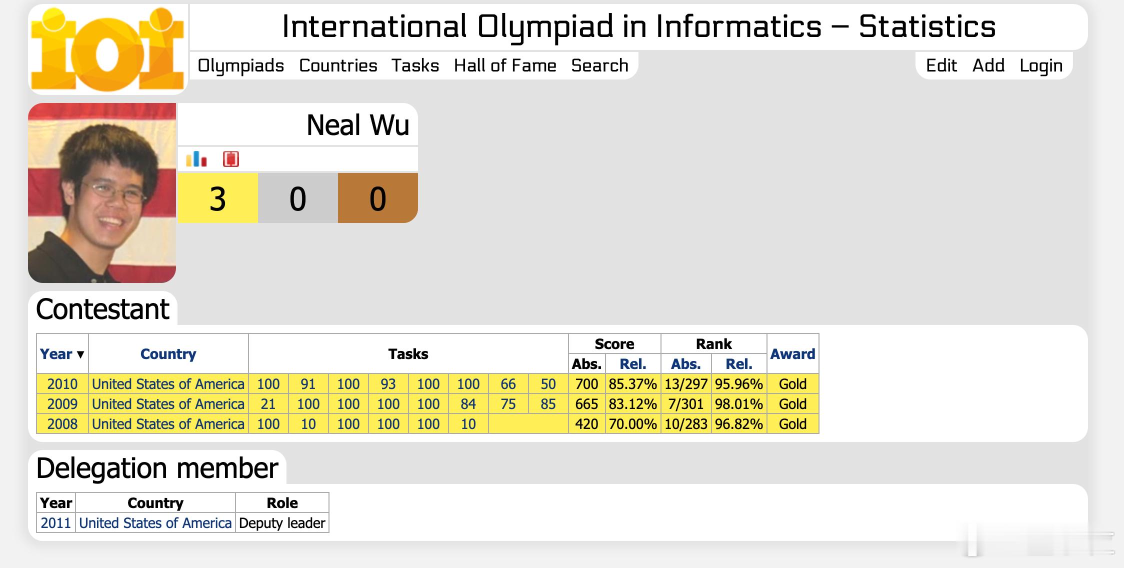 还不止一届,Neal Wu可是足足拿了三次IOI金牌,是美国队当之无愧的顶梁柱。