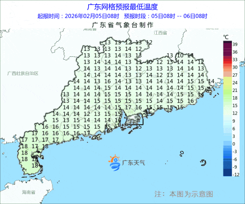 过程平均气温中北部下降6~9℃,南部下降3~5℃;过程最低气温出现在8日或9日早晨,粤北部分市县有5℃以下低温,高海拔山区1~3℃,局部有霜(冰)冻,广州过程最低气温9℃左右,10日起气温逐渐回升。
