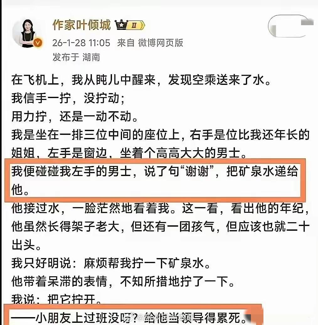 倾国倾城的叶作家,坐飞机的时候因柔弱无力让邻座大男孩帮着拧矿泉水瓶盖,可惜是给瞎子抛媚眼表错了情,男孩完全没get到。叶作家非常懊恼:这个小朋友你没情商,给你当领导得累死! 事情是这样的,知名作家叶倾城女士坐飞机的时候,怎么拧矿泉水瓶盖都没拧开,弱不禁风的她无奈之下就想求助旁边的男孩子,男孩子看起来二十出头高高大大,肯定能给解决问题。 叶女士非常有素质,不想在飞机上喧哗,就把瓶子递给男孩,说“谢谢!” 奈何男孩愣头愣脑的,看着叶女士的眼神茫然又无助,电光火石间,估计他心里想着:我是谁,我在哪儿,这位奶奶给我谁干什么?这水我有啊,这是飞机免费提供的…… 叶女士一看这孩子咋呆呵呵的呢,只好说请帮我拧一下矿泉水! 哦哦哦,男孩好像还是没明白,拧了一下没打开。后来叶女士让他拧开,他才拧开。叶女士吐槽:谁当这个孩子的领导还不得累死…… 但是吧、可但是,我怎么觉得那男孩子不一定是真的呆呢?有没有可能他心里门儿清,百思不得其解:这位奶奶看着也不像拧不开瓶盖的人啊,偏要装出柔弱无力的样子,这波操作实在看不懂,我要是随便搭茬,指不定还得接什么话,索性假装反应慢半拍,主打一个揣着明白装糊涂,能躲就躲呢……