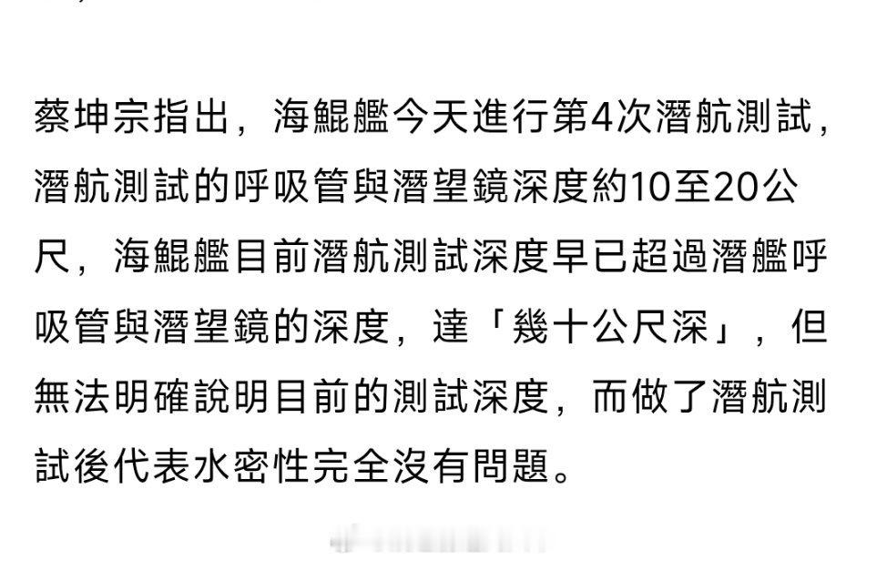 台海局势 「海鯤潛艦」昨天和今天分别进行第3次及第4次下潜试验。台船方面称,目前下潜已超通气管及潜望镜深度,达「幾十公尺深」——前几天潜至百米的报道并不准确。