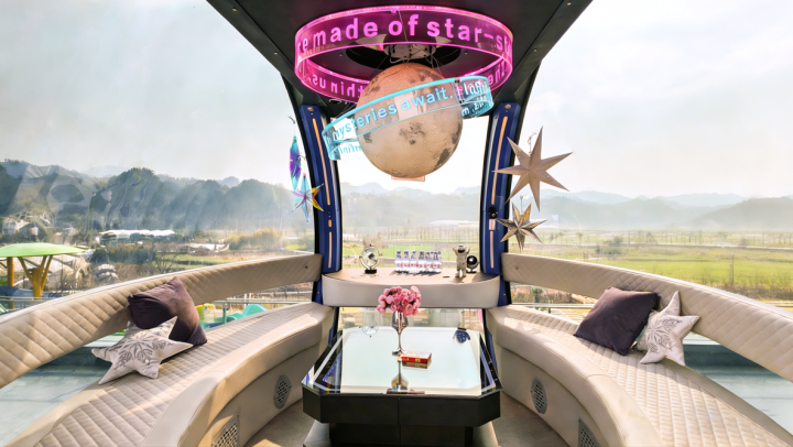 星空主题轿厢以深邃黑蓝营造梦幻星空氛围,解锁“手可摘星辰”的沉浸式体验;