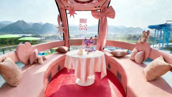 爱情主题轿厢以浪漫浅粉色为主调,打造情侣专属高空约会空间,是双节告白、甜蜜打卡的绝佳场景;