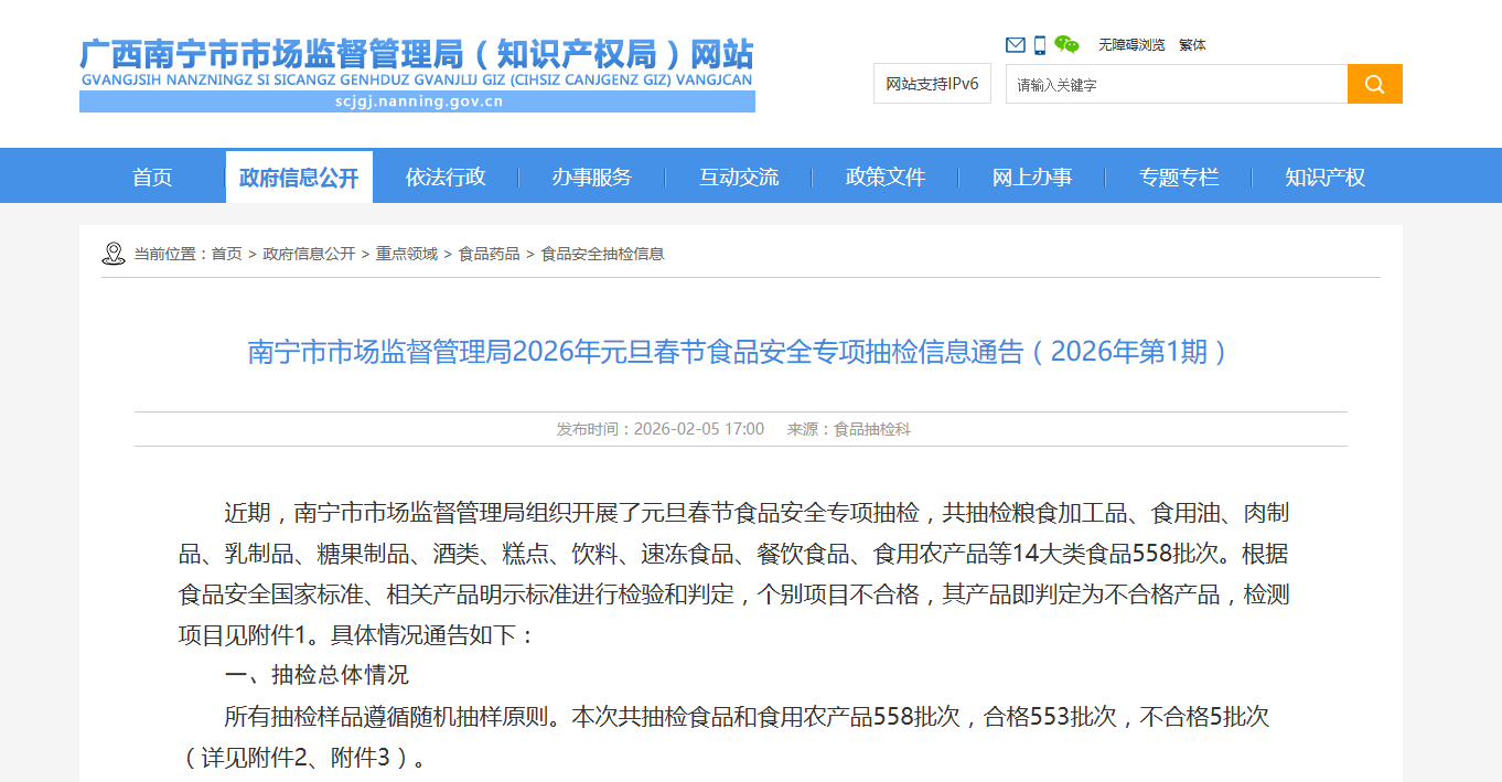 近期,南宁市市场监督管理局组织开展了元旦春节食品安全专项抽检,共抽检粮食加工品、食用油、肉制品、乳制品、糖果制品、酒类、糕点、饮料、速冻食品、餐饮食品、食用农产品等14大类食品558批次。根据食品安全国家标准、相关产品明示标准进行检验和判定,个别项目不合格,其产品即判定为不合格产品,检测项目见附件1。具体情况通告如下: