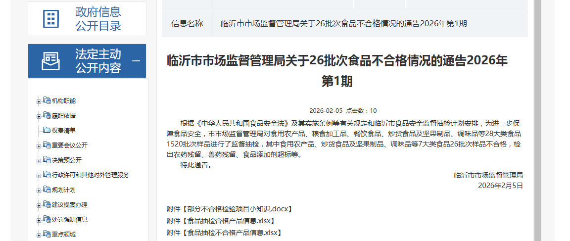 根据《中华人民共和国食品安全法》及其实施条例等有关规定和临沂市食品安全监督抽检计划安排,为进一步保障食品安全,市市场监督管理局对食用农产品、粮食加工品、餐饮食品、炒货食品及坚果制品、调味品等28大类食品1520批次样品进行了监督抽检,其中食用农产品、炒货食品及坚果制品、调味品等7大类食品26批次样品不合格,检出农药残留、兽药残留、食品添加剂超标等。