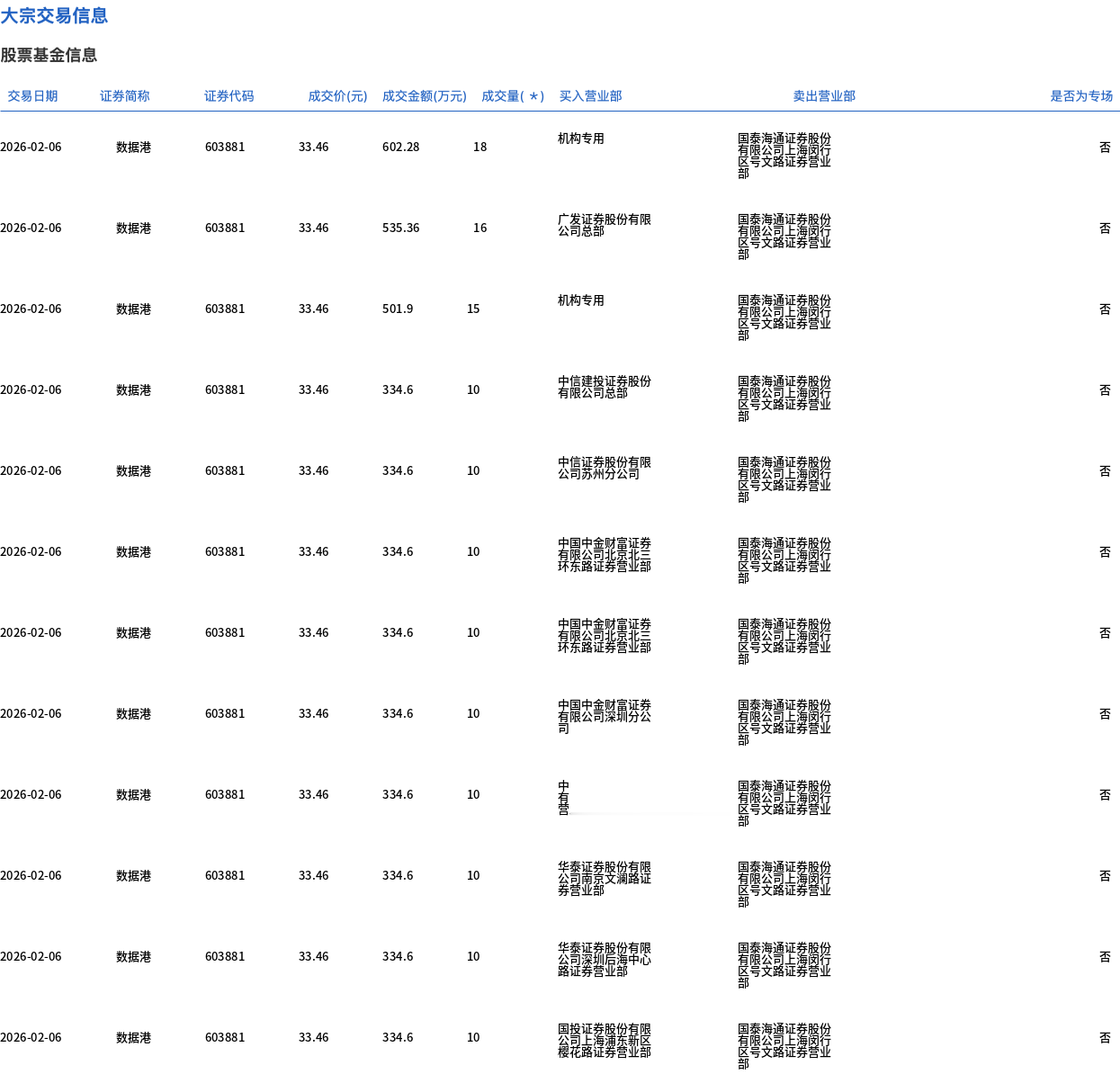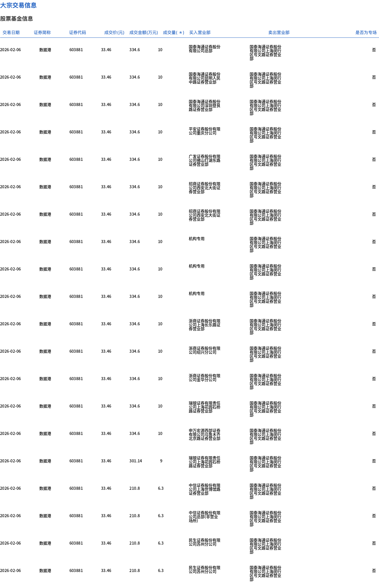 2月6日,数据港大宗交易成交323.2万股,成交额1.08亿元,占当日总成交额的2.67%,成交价33.46元,较市场收盘价39.16元折价14.56%。