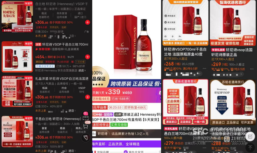 “往年春节前,轩尼诗VSOP即便促销,价格也不会跌破450元,线上那种两百多都是水货,去年换了包装,老款要尽快出货。”21世纪经济报道记者以拿货为名咨询广州某洋酒经销商,对方如此解释。