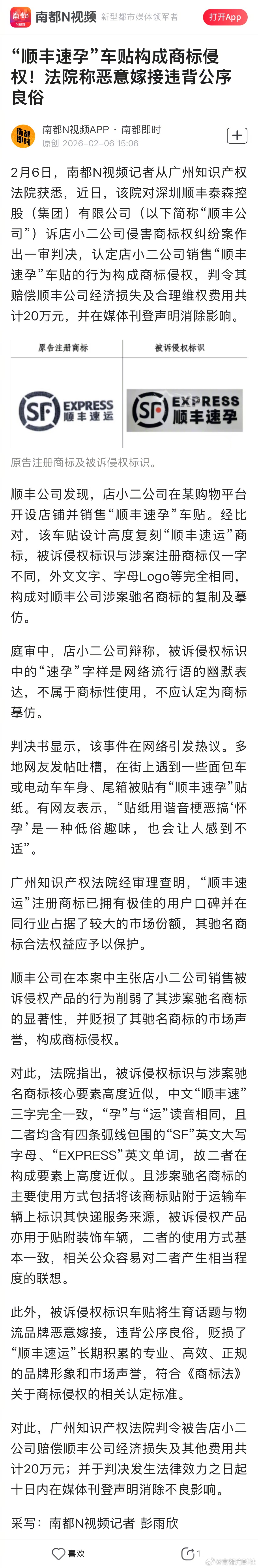 【“顺丰速孕”车贴构成商标侵权!法院称恶意嫁接违背公序良俗】#顺丰速孕车贴构成商标侵权##店小二被判赔顺丰20万元# 2月6日,南都N视频记者从广州知识产权法院获悉,近日,该院对深圳顺丰泰森控股(集团)有限公司(以下简称“顺丰公司”)诉店小二公司侵害商标权纠纷案作出一审判决,认定店小二公司销售“顺丰速孕”车贴的行为构成商标侵权,判令其赔偿顺丰公司经济损失及合理维权费用共计20万元,并在媒体刊登声明消除影响。