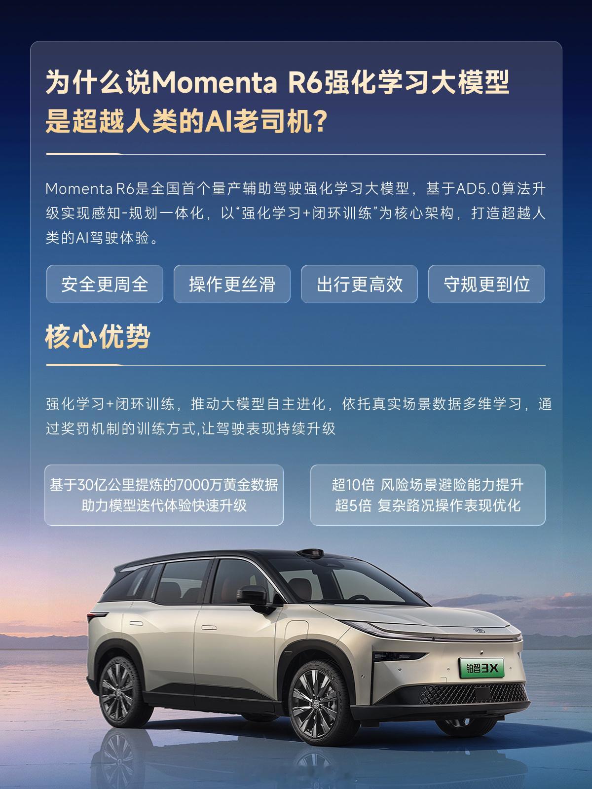 现在入手铂智 3X,就是最佳时机!安全兜底、智能升级、福利加持全拉满~ 这款车不仅达标我国已实施的 88 项汽车安全强制国标,三电 + 智驾领域更备足安全冗余,72% 高强钢车身筑牢防护,还能适配未来更严苛的安全标准,出行安全感拉满。更值得期待的是,3 月 18 日铂智 3X 将迎重磅 OTA,Momenta R6 强化学习大模型正式上车,智驾能更智能应对复杂路况,智能座舱也同步优化,越用越懂你的用车习惯。目前新春大促还在限时进行中,10 万级纯电 SUV 能享硬核安全 + 持续进化的智能体验,现在下手刚刚好!