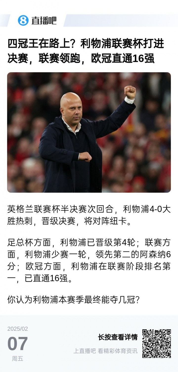 2024/25赛季,利物浦最终夺得了一座英超冠军。欧冠遭最终冠军巴黎淘汰,止步16强;联赛杯决赛不敌纽卡;足总杯止步第四轮。