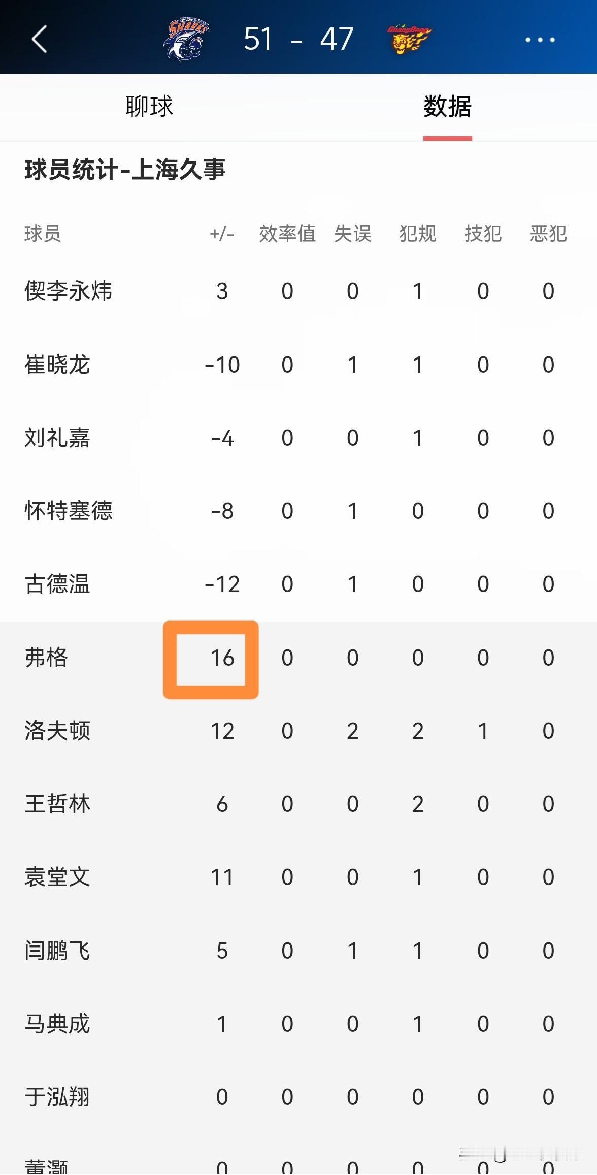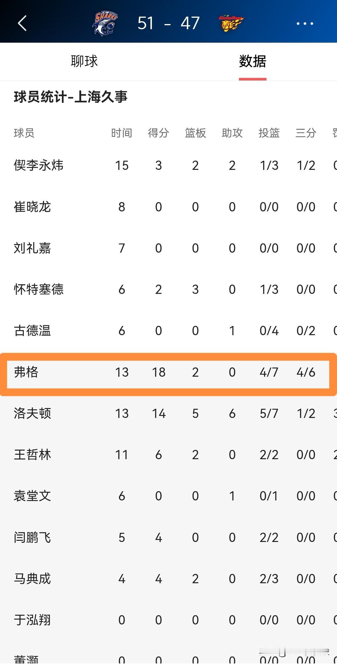 上海久事老将弗格真是大放异彩!在今天上海久事主场迎战广东东阳光的CBA俱乐部杯1/4决赛中,目前两队的上半场比赛已经结束,上海久事以51:47领先对手4分。在前两节比赛中,状态火热的弗格在进攻端大放异彩,他在替补出战的13分钟里,投篮7中4,其中三分球6中4、罚球6中6爆砍18分,外加2篮板1抢断,没有出现任何的失误,他的场上正负值为全队最高的+16。 以弗格在上半场比赛中的火热状态来看,我预感本场比赛弗格的得分起码会有35分。