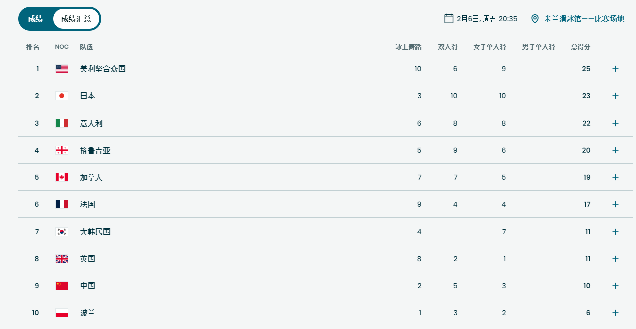 目前,花滑团体赛已经结束冰舞韵律舞、双人滑短节目和女单短节目三个项目争夺,中国队以总积分10分排名第9。