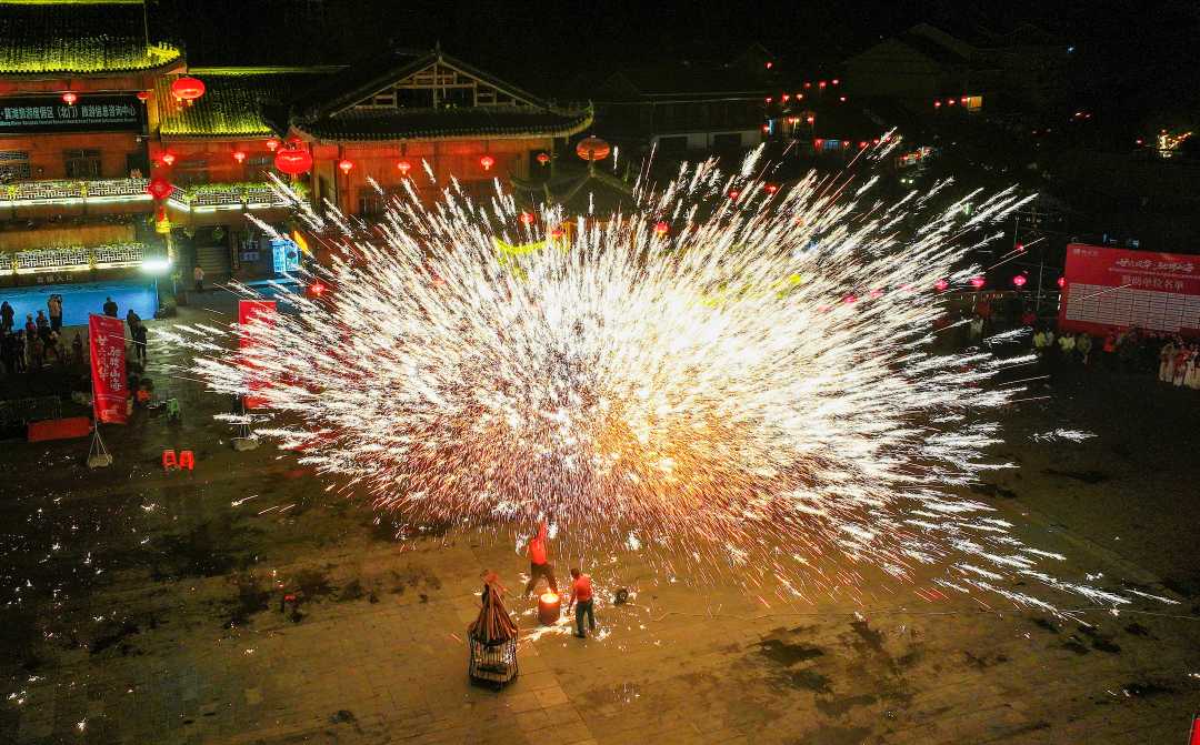 2月4日,重庆市酉阳土家族苗族自治县龚滩古镇,打铁花等非遗表演轮番上演,吸引市民游客前来观看。