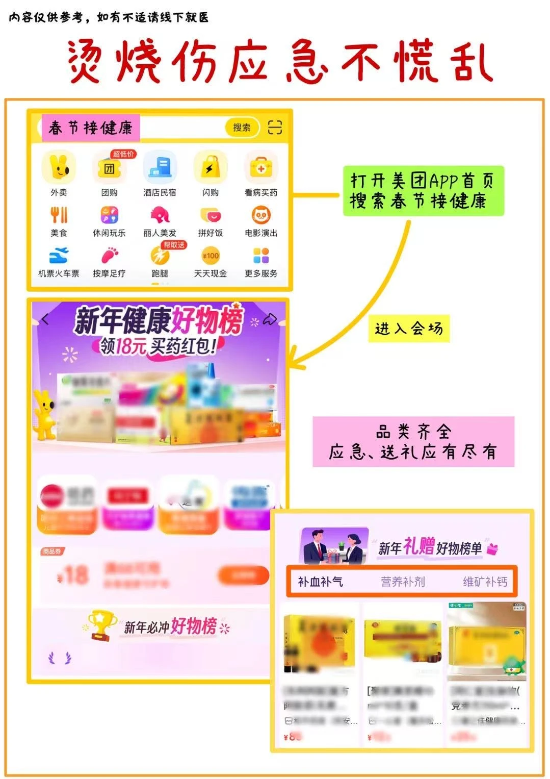 除了烫伤相关的药品,打开美团APP搜“春节接健康”进入会场,像假期刚需消化不良、解酒护肝的好物也能一站式买齐,省心又安心。