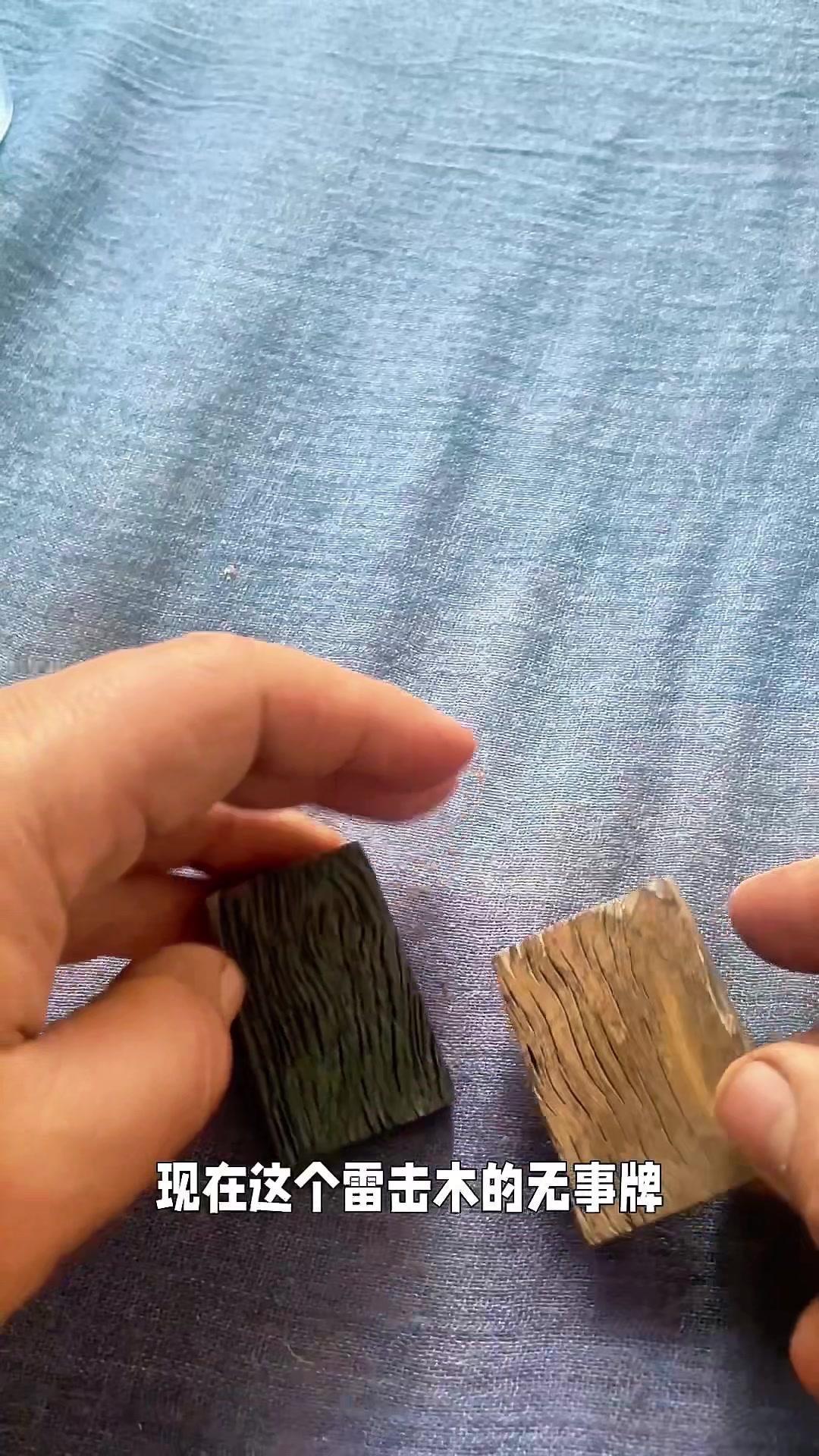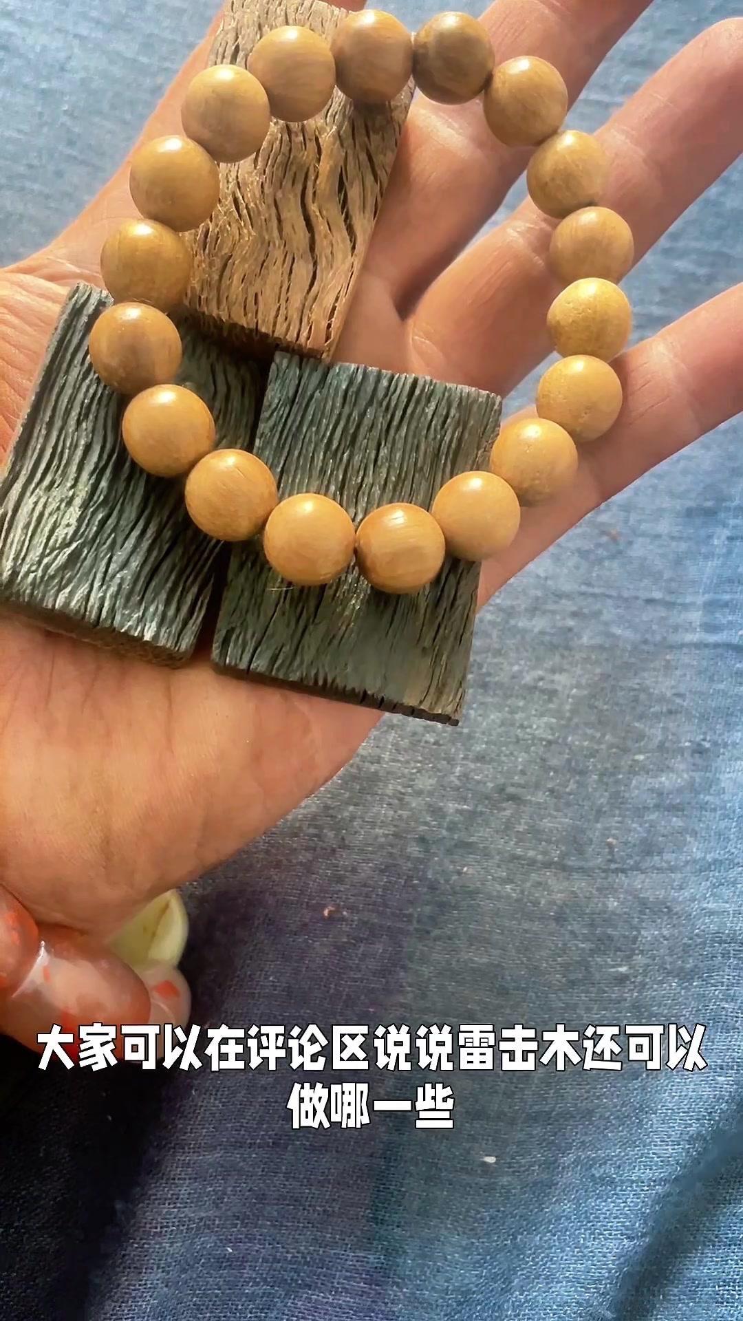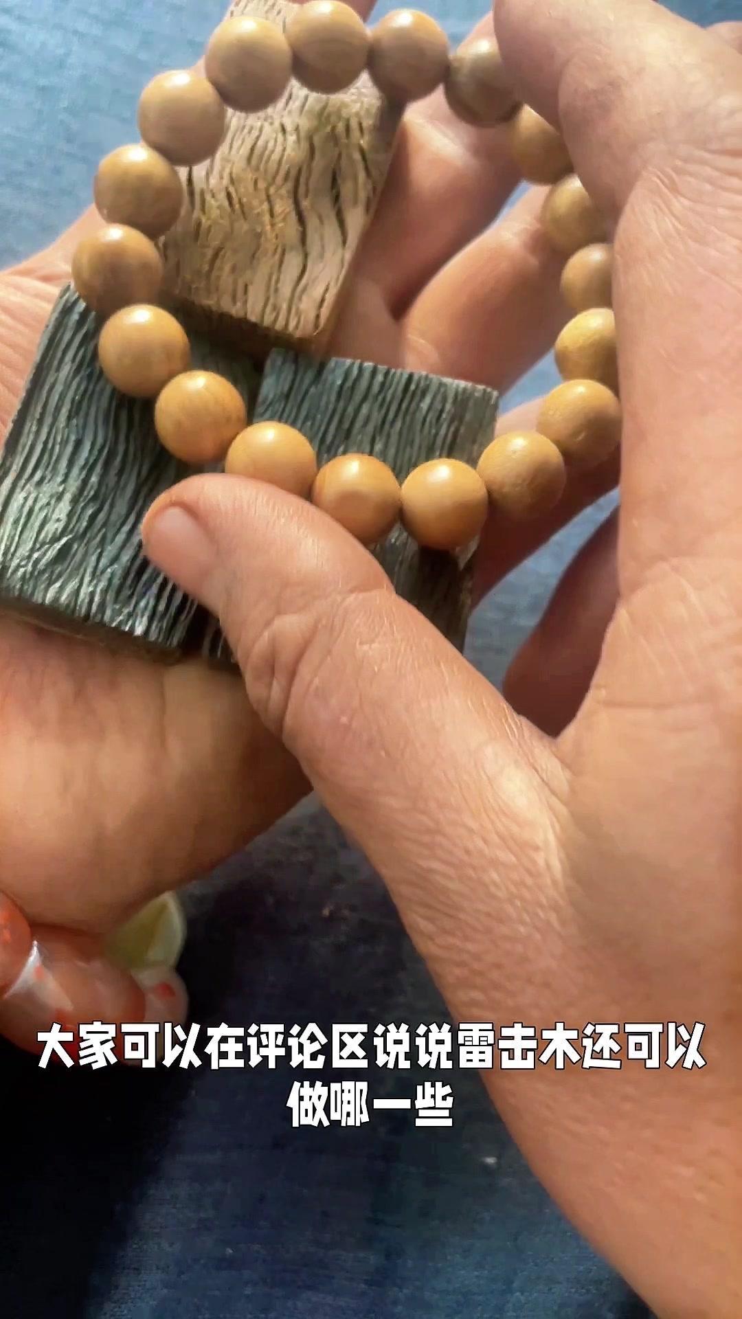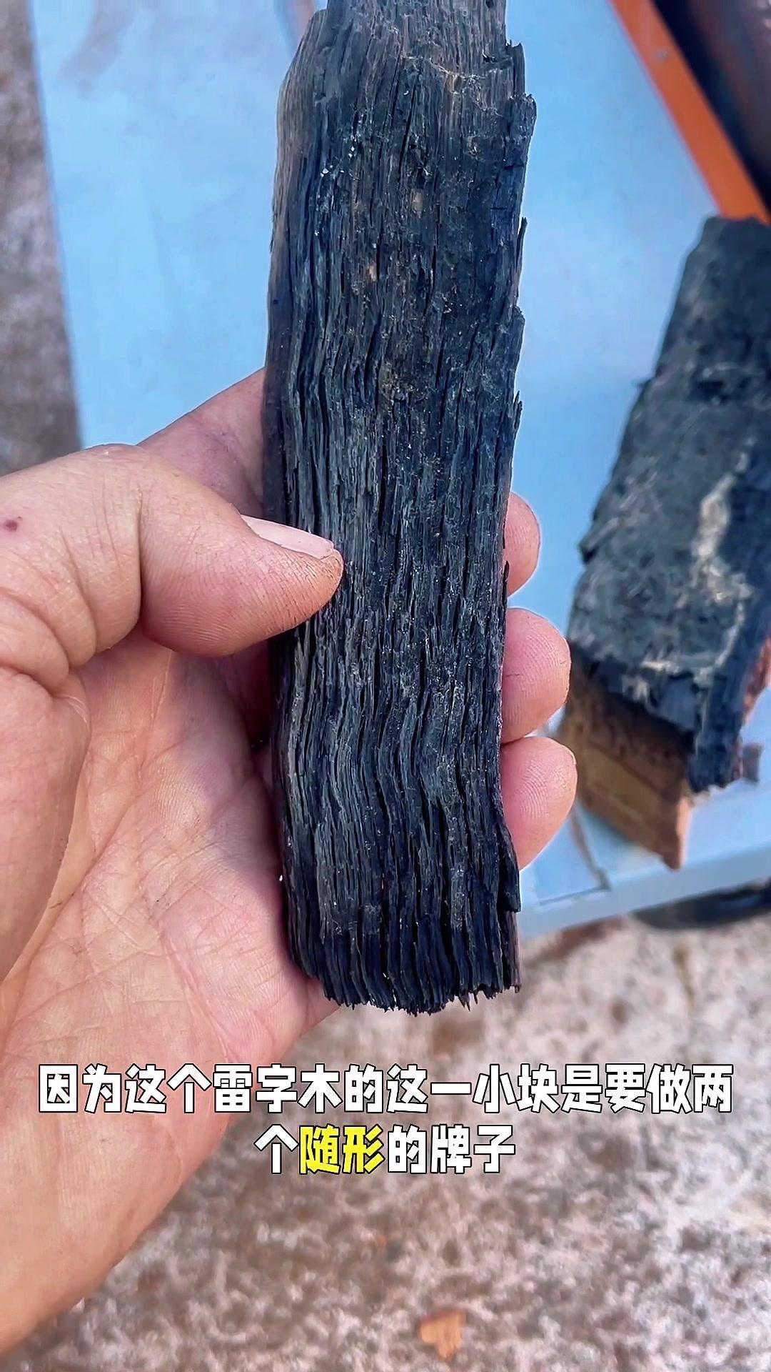 🌿朋友送来的雷击木,本想做手串,却发现裂太多不适合。好在有漂亮的雷击纹,切成随形牌子,保留烧焦的古朴感,比珠子更有韵味。 这个是没碳化的牌子,纹理清晰,另一个带点焦黑,风格更独特。本来能切四块牌子,有块抛的时候碎了,剩下三块随形的,每块都独一无二。 1️⃣处理木料:先挑出没裂的部分做牌子,有裂的改珠子,1.2的珠子大小刚好。保留烧焦痕迹,让成品更有自然古朴感。 2️⃣加工制作:用机器车出牌子形状和珠子,过程中注意避开裂纹,抛完光后穿成手串,无事牌就完成了。虽然木料硬度一般,但雷击木的特殊纹理让它更有价值。 大家觉得雷击木除了珠子和牌子,还能做成什么?
