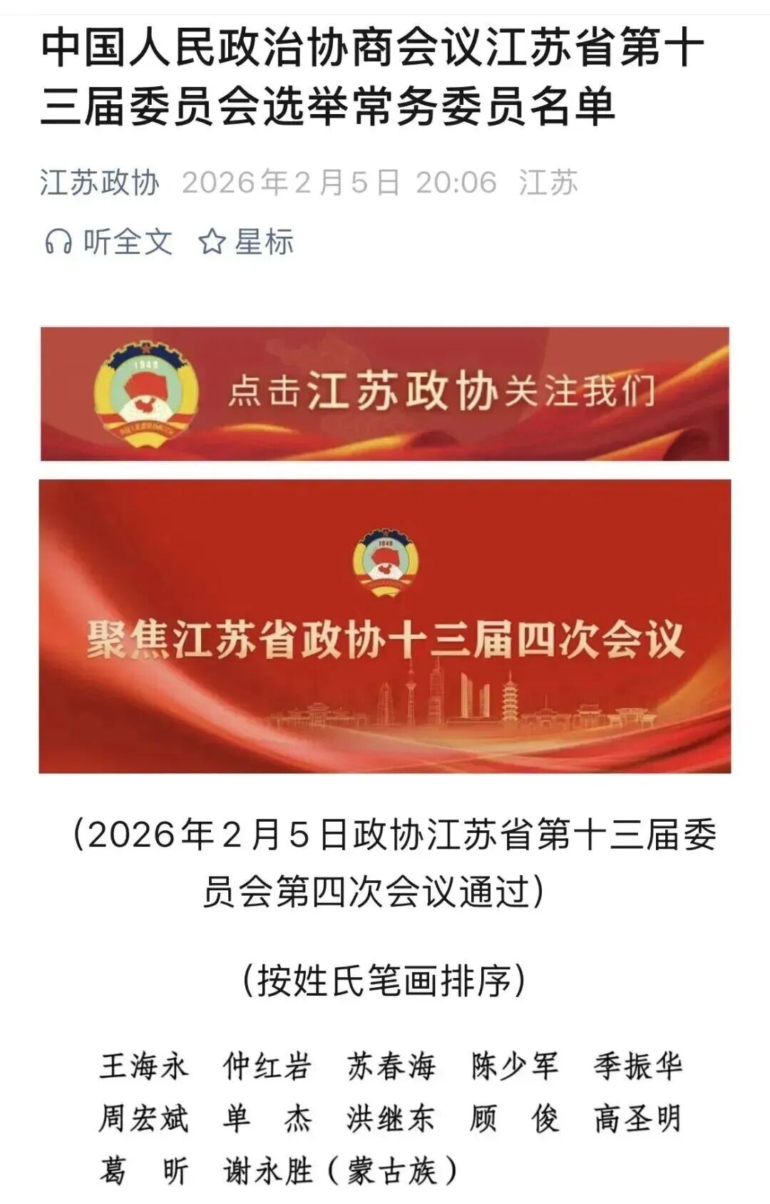 本次会议于2026年2月2日至5日召开,是江苏省政协年度重要政治议程之一。会议聚焦全省经济社会高质量发展大局,广泛凝聚共识,积极建言献策,并顺利完成各项选举任务。根据大会公告,本次共增补12位同志为政协江苏省第十三届委员会常务委员,按姓氏笔画排序分别为:王海永、仲红岩、苏春海、陈少军、季振华、周宏斌、单杰、洪继东、顾俊、高圣明、葛昕、谢永胜(蒙古族)。