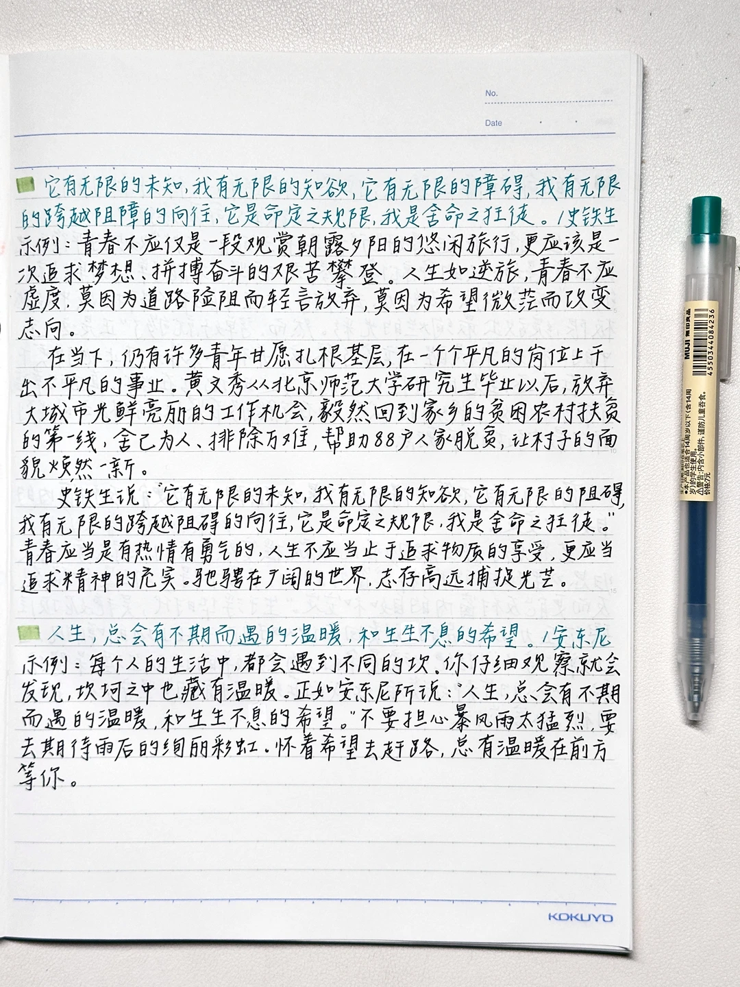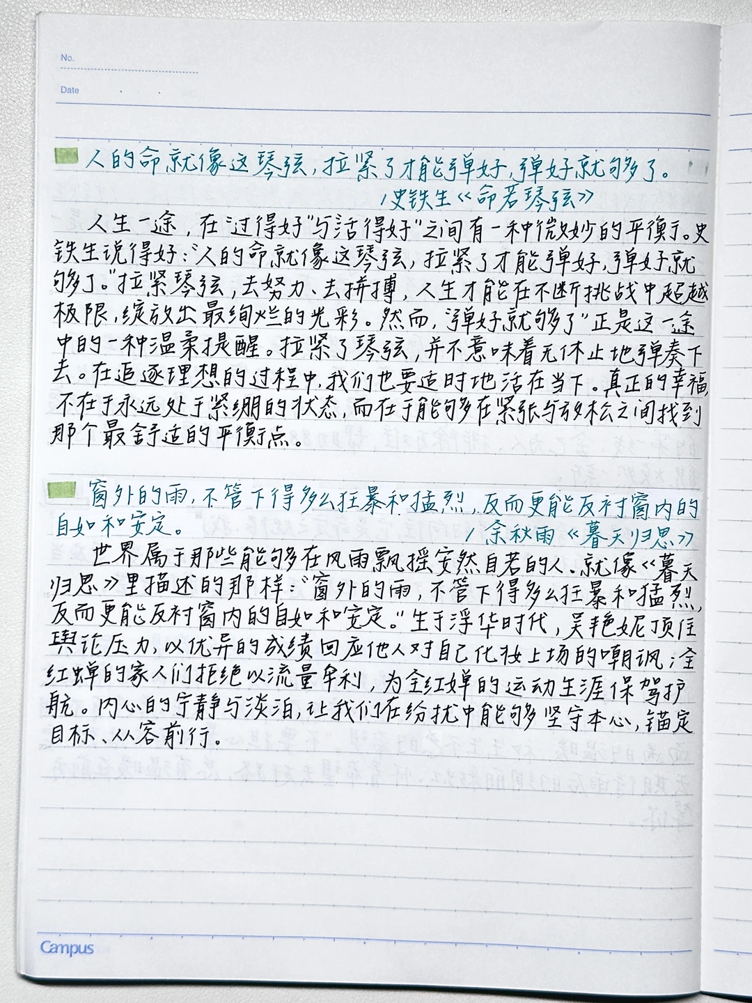 - 晚上好呀大家!本期的句子来喽! 素材来自:纸条 - 它有无限的未知,我有无限的知欲,它有无限的阻障,我有无限的跨越阻障的向往,它是命定之规限,我是舍命之狂徒。 /史铁生 人生,总会有不期而遇的温暖,和生生不息的希望。 /安东尼 人的命就像这琴弦,拉紧了才能弹好,弹好就够了。 /史铁生《命若琴弦》 窗外的雨,不管下得多么狂暴和猛烈,反而更能反衬窗内的自如和安定。 /余秋雨《暮天归思》 - 祝各位快要考试的同学, 顺顺利利,心想事成!