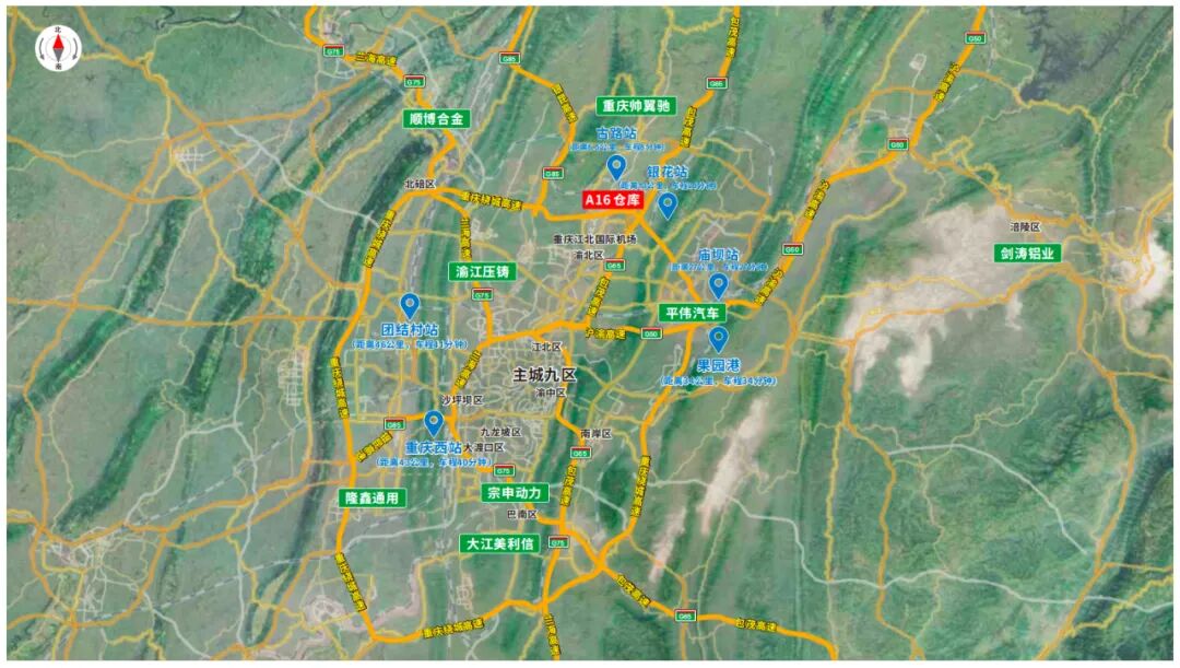 航空:无缝衔接江北国际机场货运站;铁路:6.5公里直抵重庆东环铁路;水运:30公里通达长江黄金水道果园港(可泊5000吨级船舶);公路:3公里接驳绕城高速,覆盖主城。