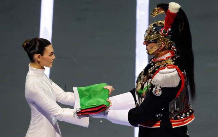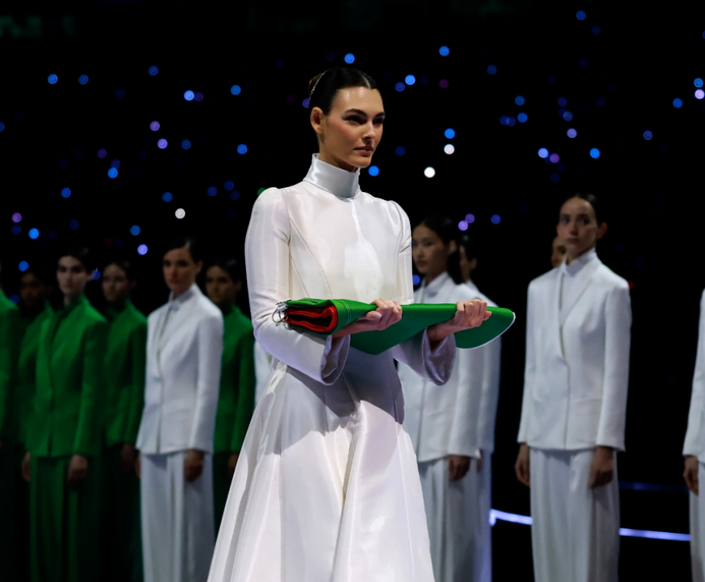 在米兰冬奥会开幕式上,维托里亚-切雷蒂身穿意大利奢侈品牌乔治-阿玛尼设计的纯白色长裙,带领超模方队完成国旗交接仪式。她以优雅气质和挺拔身姿将现场氛围推向高潮,被网友形容为“竞技赛场秒变T台秀场”。
