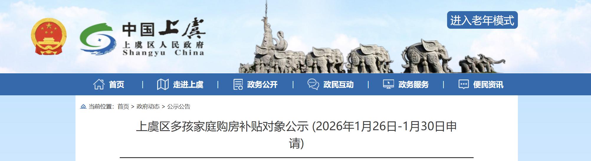 近日,绍兴上虞区人民政府发布一则《上虞区多孩家庭购房补贴对象公示(2026年1月26日-1月30日申请)》。