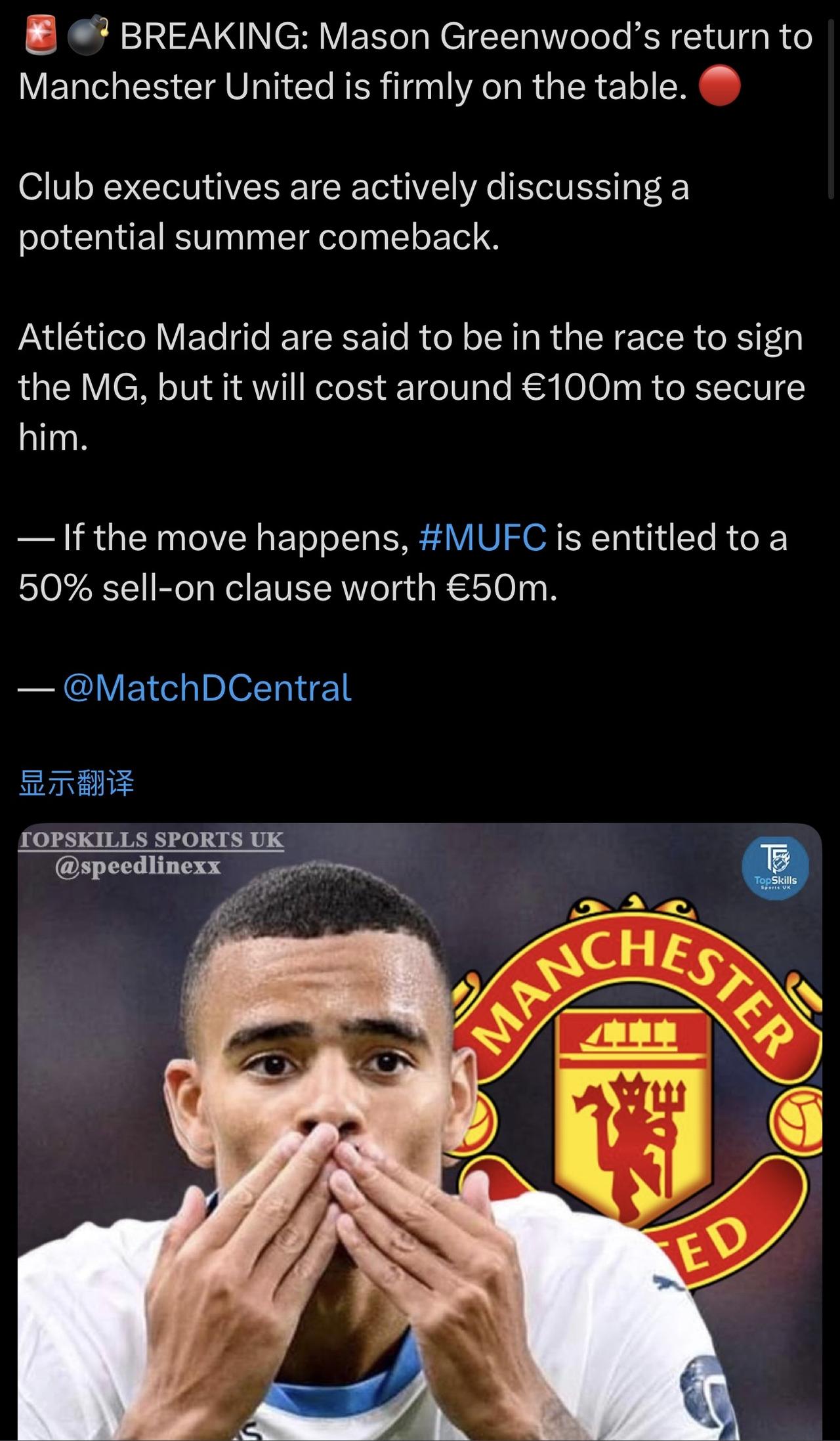 格林伍德 球确实踢的不错,但曼联早就不是一个纯粹的足球俱乐部了。 5000千欧元和被妇女组织天天骂之间,曼联肯定选5000万的。 ……………………………………………………………… 突发新闻:梅森·格林伍德重返曼联的可能性已基本确定。 🔴 俱乐部高层正在积极讨论今夏可能的回归事宜。 据称马德里竞技也加入了签下米内罗的竞争,但签下他大约需要花费 1 亿€ 。 — 如果该举措发生, MUFC有权获得价值€ 5000 万的 50% 转售条款