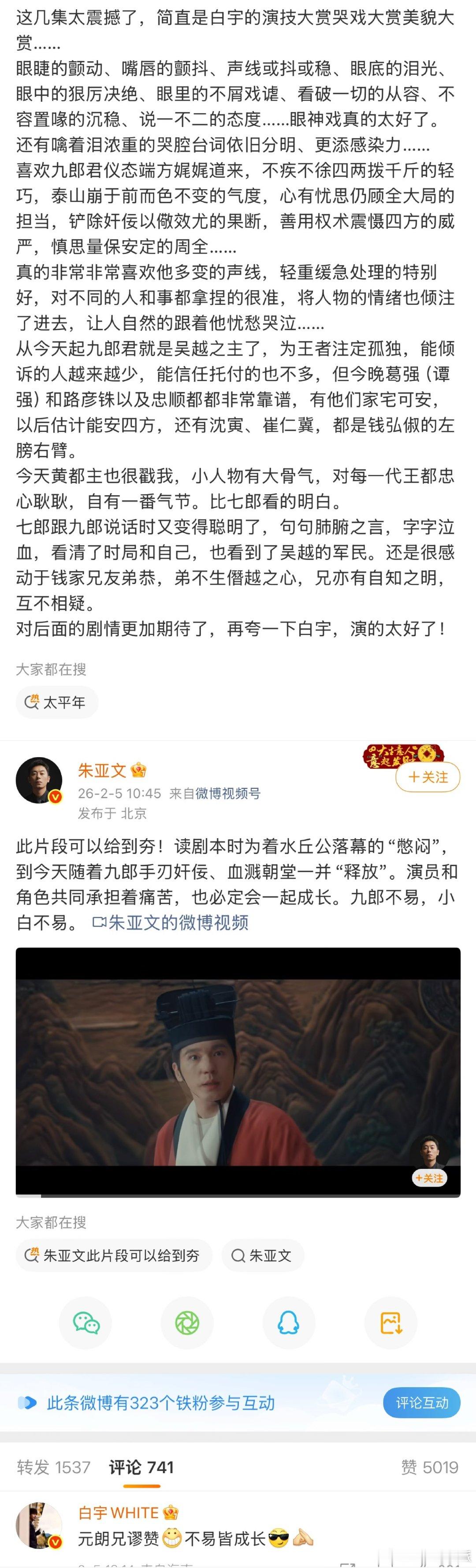 从少年九郎的灵动跳脱,到吴越君主的沉敛克制,他用眼神和微表情完成了角色成长的蜕变;原声台词沉稳有力,朝堂质问那场不用看字幕都能听得清清楚楚;尤其是哭戏,一滴泪能演出不同情绪,不用刻意渲染,就让人感受到那份乱世中的孤独与责任?播到现在演技名场面已经有不下7.8处,处处都是人生镜头!尤其是几处看似平静的演绎,但是表现却令人震撼!
