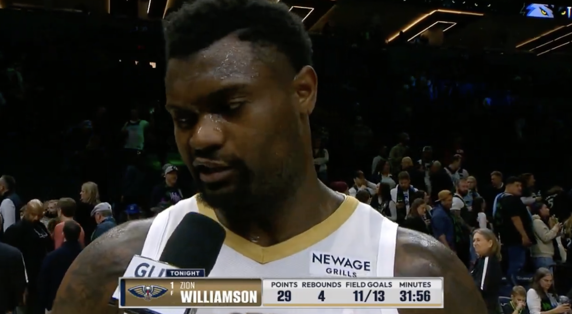 本场比赛,鹈鹕队球员蔡恩-威廉森出战32分钟,投篮13中11,罚球9中7,得到29分4篮板1助攻。