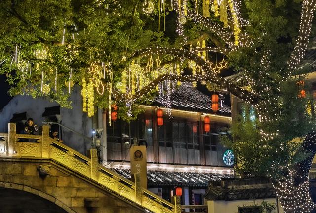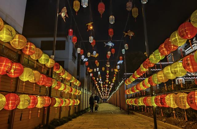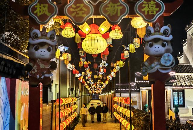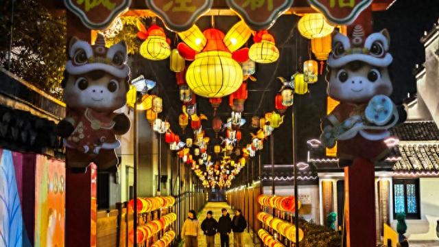 马年新春佳节临近,金山区枫泾古镇围绕马年主题与江南水乡韵味,布置了新春灯光场景。