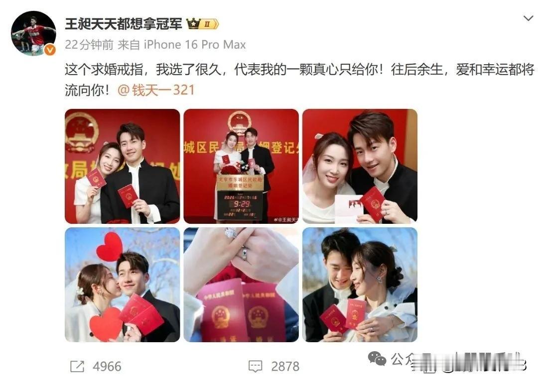 2月7日,国羽新年添一喜事-王昶钱天一官宣领证啦!恭喜恭喜! 刚刷到这个信息时,感到挺诧异的,主要是之前没有关注到他的感情动向,突然看到结婚的消息。新郎新娘都是我国体育界的明星,王昶,国羽一号男双,和梁伟铿搭档夺得2024年巴黎奥运会的银牌,钱天一是我国一名乒乓球运动员!