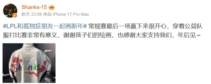 直播吧2月7日讯在昨日的LPL第一赛段比赛上,AL击败BLG拿下胜利,赛后Shanks更博:常规赛最后一场赢下来很开心,穿着公益队服打比赛非常有意义,谢谢孩子们的绘画,也感谢大家支持我们,年后见~