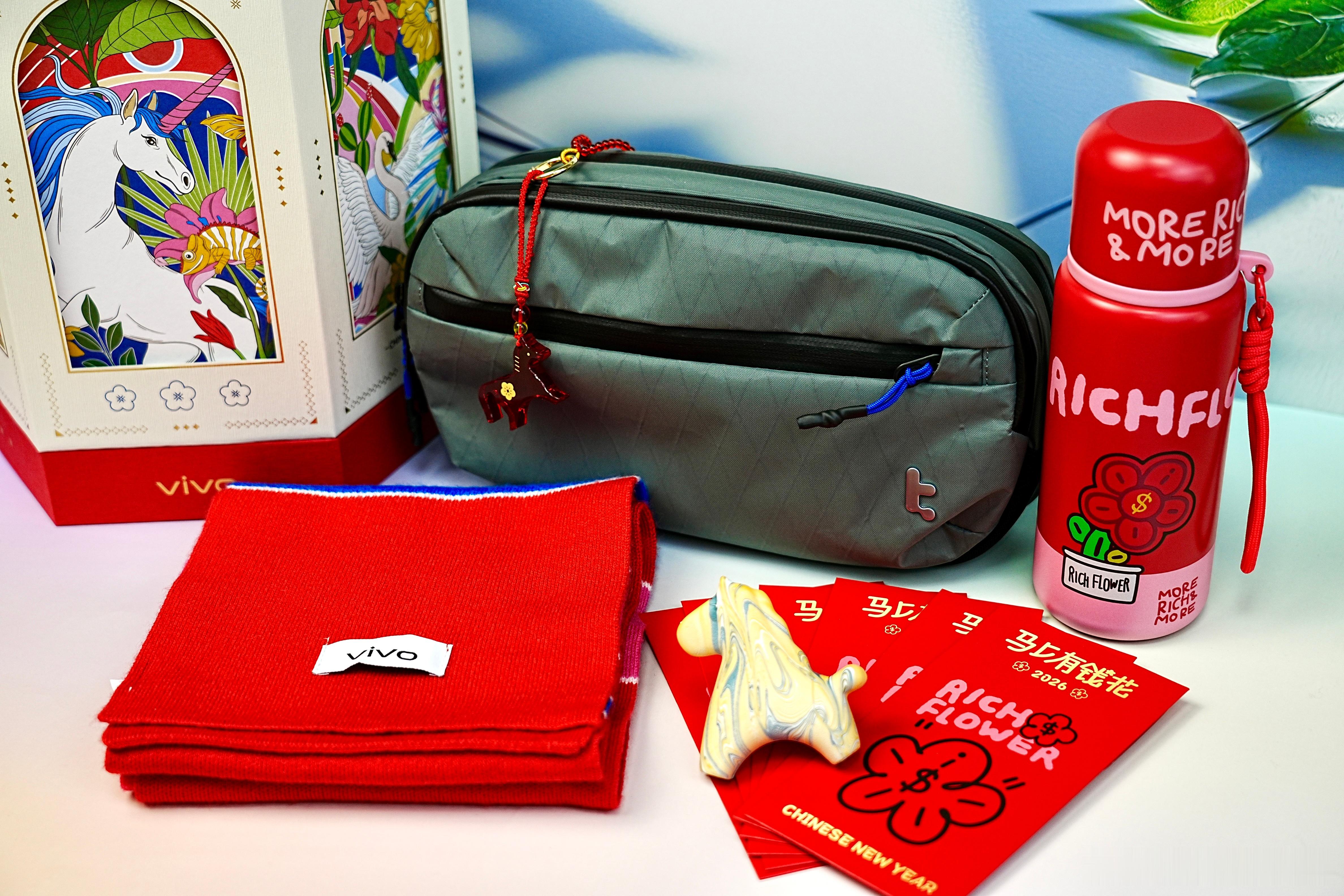 vivo收到vivo寄来的2026马上有福新春礼盒,好大一箱内容很丰富,里面有tomtoc定制轻行斜挎包,保温杯,定制红包,琉璃包挂件,100%羊毛围巾和一套陶瓷车载香薰,真的是实用精致马年氛围感拉满
