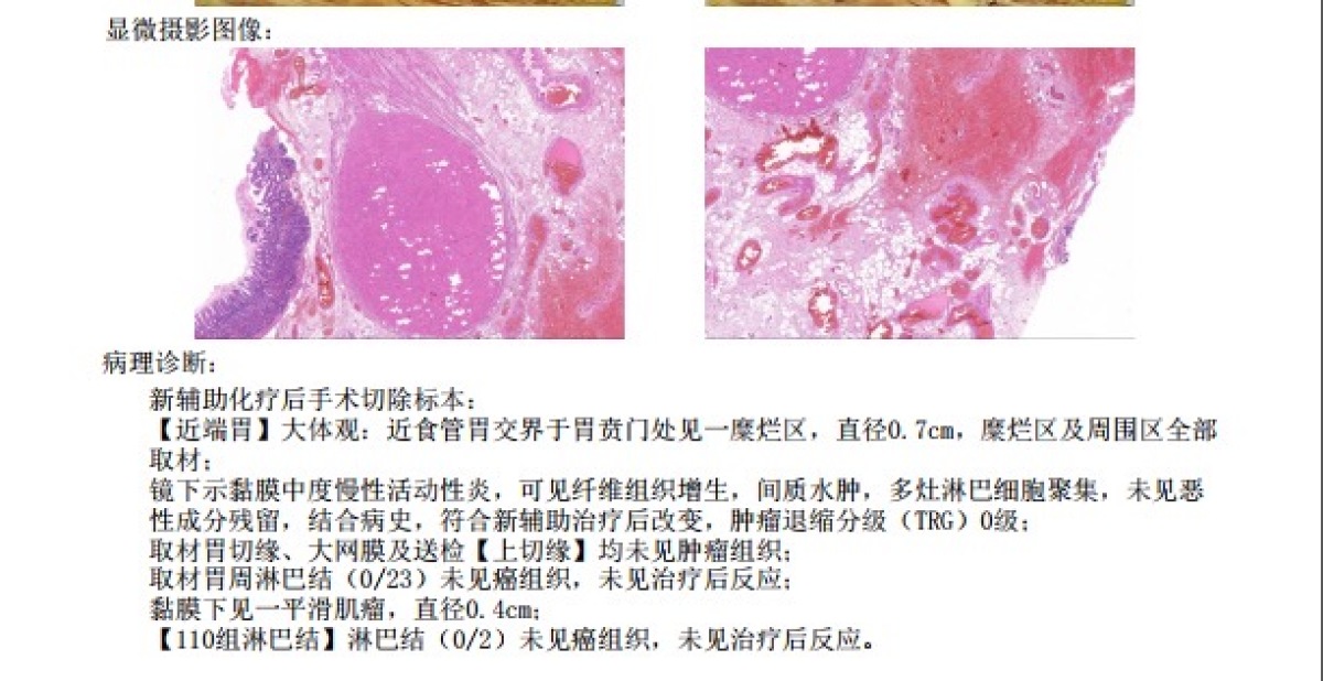经过精心治疗和密切监测,杨先生的肿瘤明显缩小,随后顺利接受了胃癌根治手术。术后病理报告显示,肿瘤细胞完全消失,TRG分级达到0级,即“完全病理缓解”。这意味着,经过新辅助治疗,杨先生体内的胃癌细胞已被完全清除,治疗效果堪称完美。