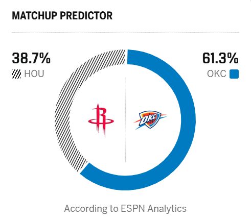 ESPN预测明日比赛:雷霆胜率为61.3%,火箭胜率为38.7%