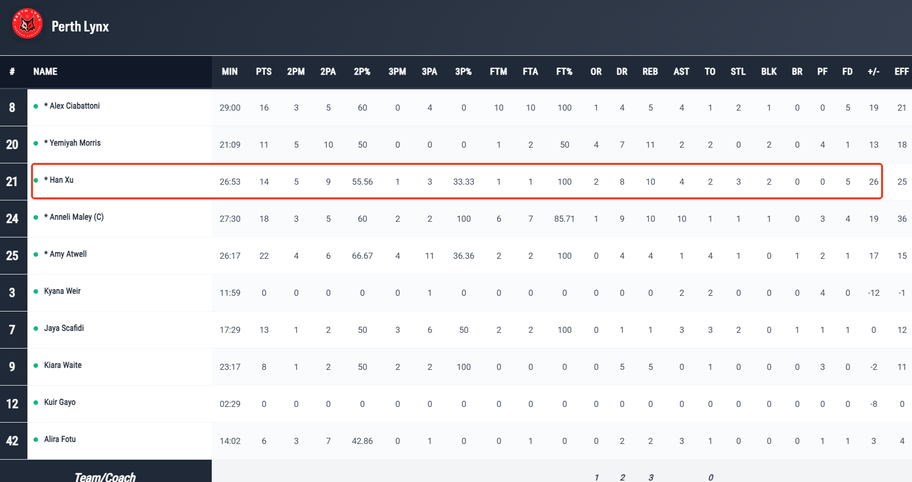 WNBL联赛:韩旭14分10板,珀斯山猫大胜Sydney Flames