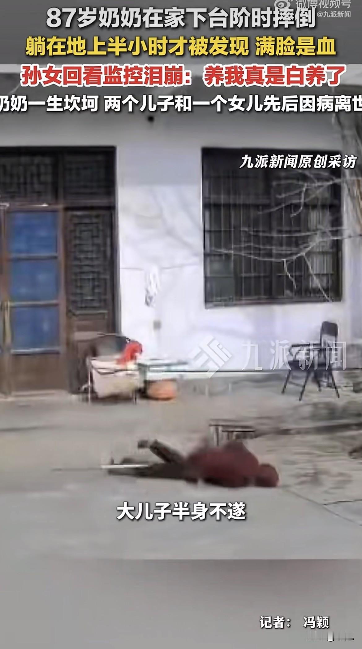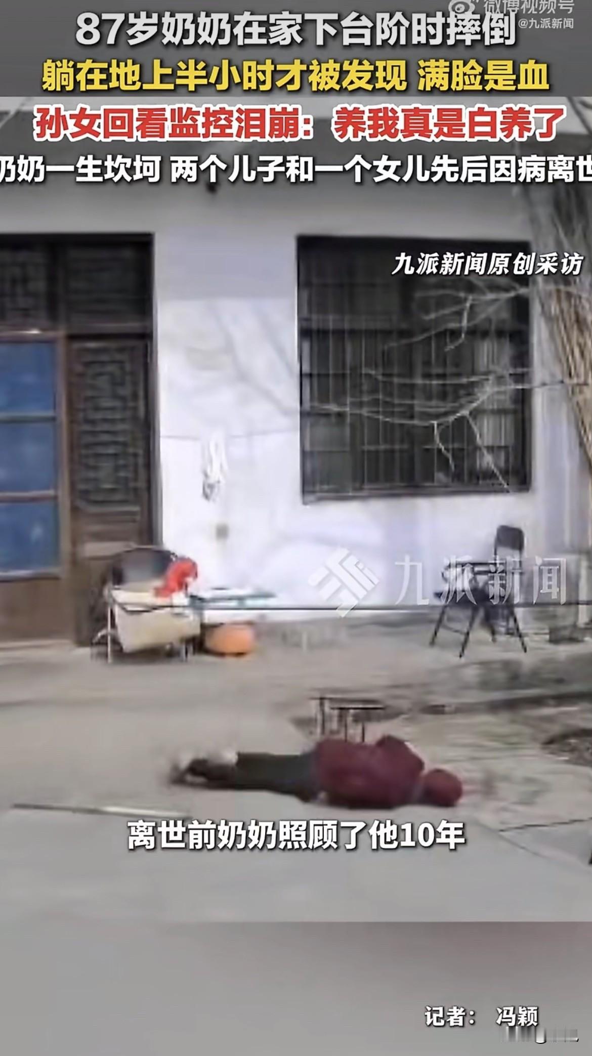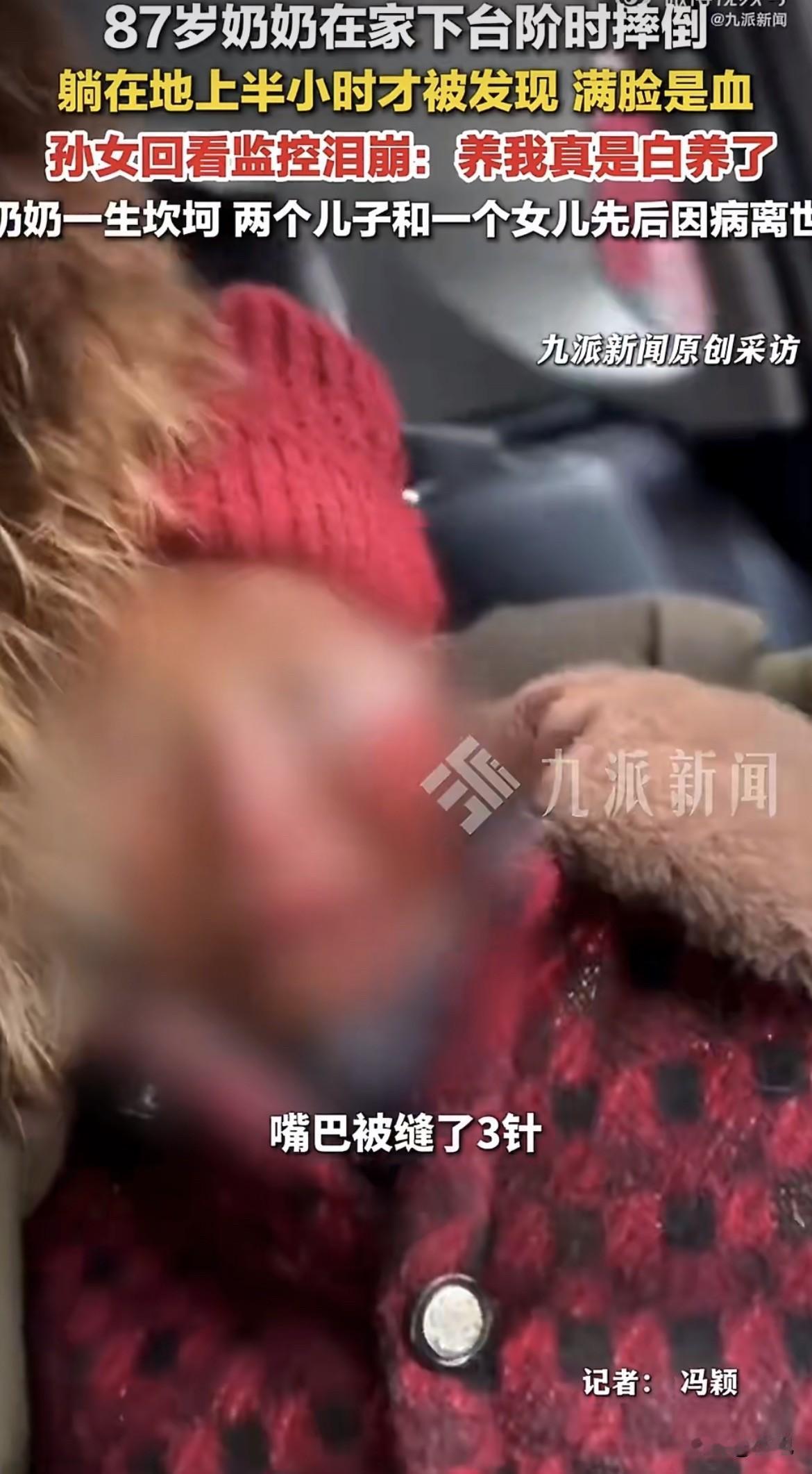 监控画面里,87岁的奶奶面朝下倒在水泥台阶下,一动不动。时间显示,那个姿势已经保持了整整三十分钟。 孙女徐女士看到回放时,感觉呼吸都停了。她冲到现场,奶奶浑身是血,脸肿得厉害,嘴巴后来缝了三针。老人就那么趴在地上,等来了被发现的那一刻。 家里不是没人。90岁的爷爷就在屋里。可爷爷耳背得厉害,门外的动静,一点都没听见。一个摔倒了喊不出声,一个听不见。老两口相伴一生,那一刻却被隔在了两个完全不同的世界。 徐女士和姑姑每天都来照料,洗衣做饭,陪他们说说话。但“每天来”和“一直在”是两回事。她们总有离开的那么几个小时,空白就出在了这里。徐女士说了一句:“养我真是白养了。”这话里没有责怪,全是扎进心里的疼和无力。 这家的日子,苦水里泡得太久。奶奶这一生,送走了两个儿子和一个女儿,都是生病走的。大儿子生前半身不遂,整整十年,是奶奶一把屎一把尿地伺候。白发人送黑发人,送走一个又一个,得用多硬的骨头,才能扛住这种疼。 她明明那么刚强,熬过了那么多撕心裂肺的离别,最后却可能绊倒在自家门口最熟悉的那几级台阶上。这对比,让人心里发沉。一辈子的大风大浪都过来了,最怕的反而是脚下这一点小小的、偶然的不平。 很多家里有老人的,看了都心里一紧。老人身体看着还行,但骨头脆了,反应慢了,家里一个不起眼的小坎、地上一块稍微滑一点砖,都可能要了命。他们自己又怕麻烦孩子,摔了疼了,常常忍着不说。等子女发现,伤情已经耽误了。 这件事像一根针,扎到了无数中国家庭最怕碰的那个地方:我们到底该怎么护着风烛残年的爸妈?每天看一眼,真的够吗?装个摄像头,真的有用吗?那份提心吊胆,好像怎么做都填不平。 奶奶摔倒的那半小时,是一面镜子。它照出的不是一家一户的偶然,而是人老了以后,那种无处不在又无声无息的危险。它就藏在日复一日的寻常里。 看着监控流泪的孙女,那份愧疚是真真的。但这件事,或许不该止于愧疚。它更像个沉重的提醒,提醒我们得去为父母做点更具体、更实在的事。比如,仔细看看他们每天走的路上,有没有“陷阱”。 你觉得,除了每天抽空去看看,还能做哪些实实在在的小事,能防住这种意外?如果你家里也有老人,有什么特别的观察或办法可以分享吗?